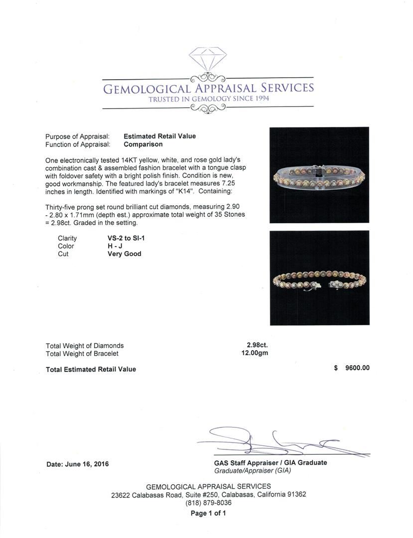 One electronically tested 14KT yellow, white, and rose gold lady's combination cast & assembled fashion bracelet with a tongue clasp with foldover safety with a bright polish finish. The featured lady's bracelet measures 7.25 inches in length. Identified with markings of "K14". Condition is new, good workmanship. Containing: Thirty-Five prong set round brilliant cut diamonds, measuring 2.90 - 2.80 x 1.71mm (depth est.) approximate total weight of 35 Stones = 2.98ct. Graded in the setting. Clarity: VS-2 to SI-1. Color: H - J. Cut Very Good. Total Weight of Diamonds 2.98ct. Total Weight of Bracelet 12.00gm GAS Appraised at $9,600.00.