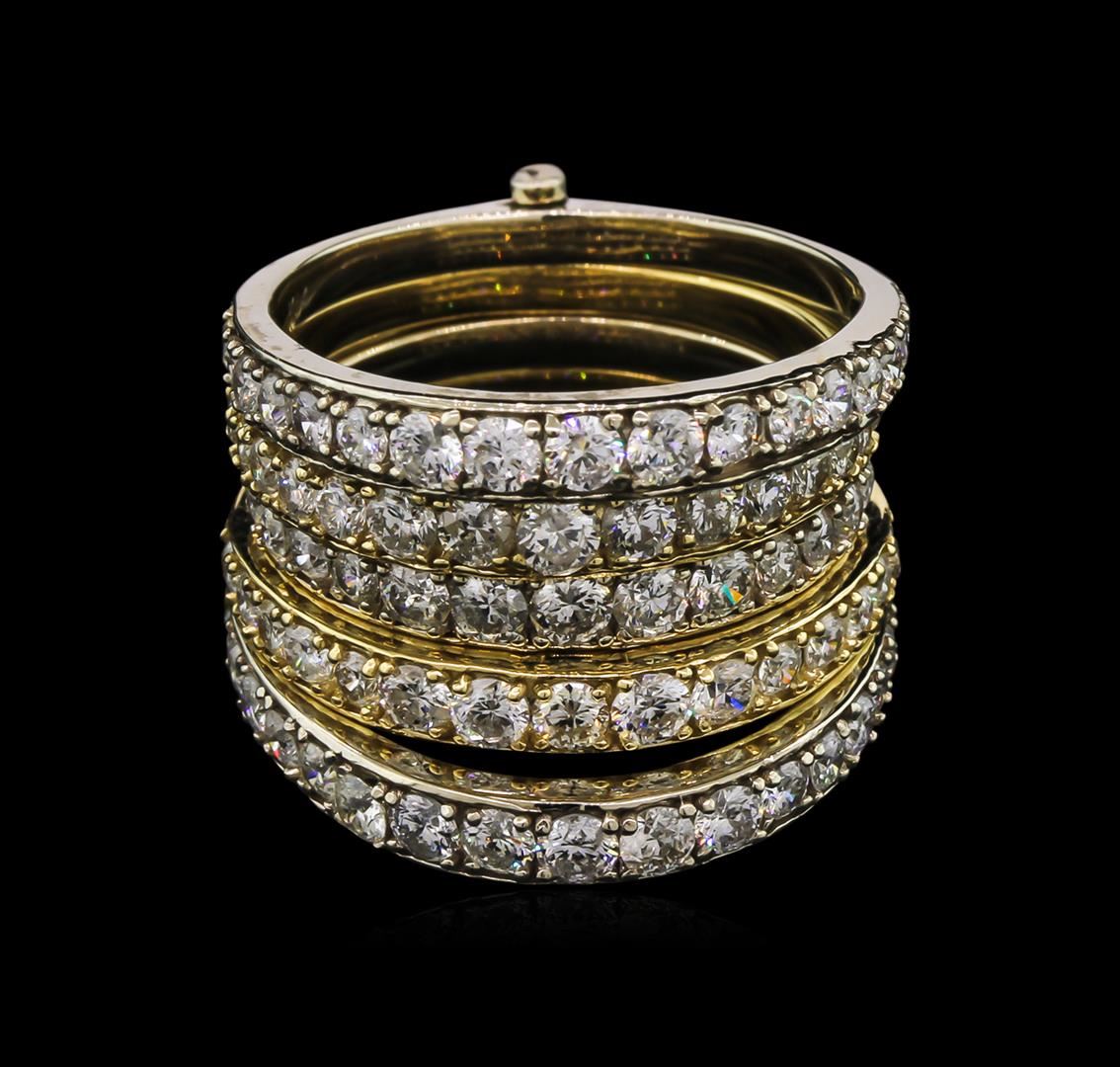 One electronically tested 14KT white and yellow gold lady's combination cast & assembled fashion ring with a bright polish finish. The featured ladies ring has five (5) tapered and graduated diamond bands that are pinned at the bottom of the shank allowing movement of all five bands, the ladies ring has a10.75 millimeter shank in width. Identified with markings of "K14". Condition is new, good workmanship. Containing: Seventy-Seven prong set round brilliant cut diamonds, measuring 2.80 - 1.80 x 1.40mm (depth est.) approximate total weight of 77 Stones = 2.98ct. Graded in the setting. Clarity: SI-2 to I-1. Color: I - Good. Total Weight of Diamonds 2.98ct. Total Weight of Ring 12.00gm. GAS Appraised at $7,735.00.