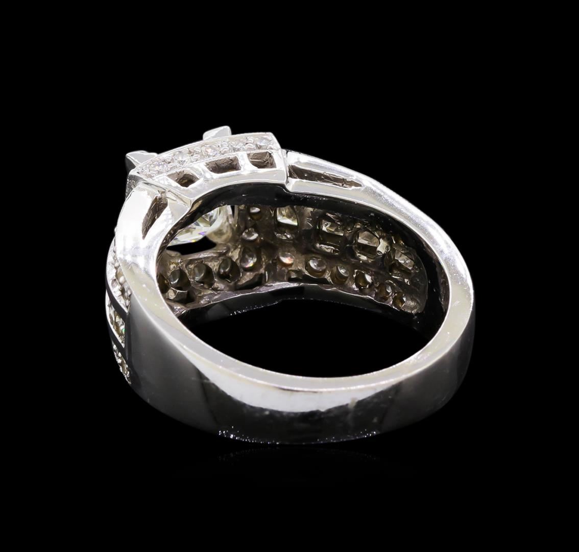 One electronically tested 14KT white gold lady's cast three row wide band halo wedding ring with a bright polish finish. The featured ladies wedding ring has a shank measures 4.14 millimeters in width. Identified with markings of "14K". Condition is new, good workmanship. Containing: One prong set princess cut diamond, measuring 6.68 x 6.45 x 4.53mm (depth est.) approximate weight of 1.54ct. Graded in the setting. Clarity: VS-1. Color: I. Cut Very Good Ten channel set princess cut diamonds, measuring 2.40 x 2.20 x 1.65mm (depth est.) approximate total weight of 10 Stones = 0.70ct. Graded in the setting. Clarity: VS-1 to VS-2. Color: G - Very Good Fifty prong set round brilliant cut diamonds, measuring 1.60 - 1.55 x 0.98mm (depth est.) approximate total weight of 50 Stones = 0.74ct. Graded in the setting. Clarity: VS-1 to SI-1. Color: H - I. Cut Very Good. Total Weight of Diamonds 2.98ct. Total Weight of Wedding Ring 8.20gm. GAS Appraised at $25,575.00.