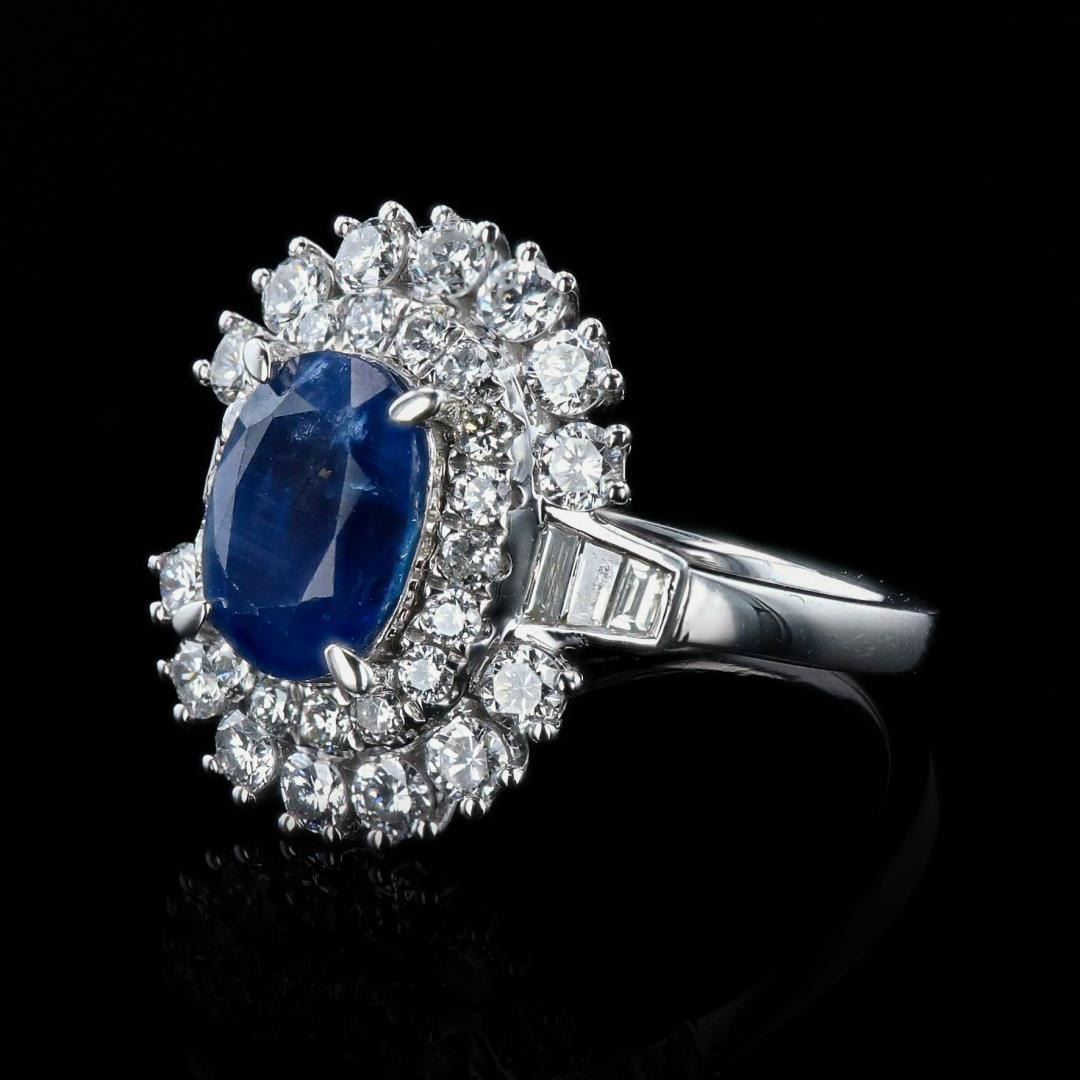 One polished, stamped, and tested platinum ring marked Oscar Friedman. The ring is mounted with: 1 genuine GIA certified unheated sapphire center stone weighing approximately 2.98 carats, and 38 genuine faceted diamonds weighing approximately 1.37 carats. This item weighs 8.8 grams, condition is new, excellent workmanship. #MAIN GEMSTONE# GIA Report No.: 2235253302; Species: Natural Corundum; Variety: Natural Sapphire; Origin: Burma (Myanmar); Shape: Oval; Cutting Style: Brilliant Cut Crown, Step Cut Pavilion; Measurements: 9.30 x 6.66mm; Weight: 2.98 carats; Color: Blue; Transparency: Transparent; Treatment: None; Refractive Index: 1.762 - 1.770 DR; Birefringence: 0.008 - 0010; Hardness: 9 #ADJACENT GEMSTONES ON RING# Identity: Natural Diamond; Shape & Cutting Style: Baguette / Round Brilliant; Quantity: 28 Diamonds; Measurements: 2.0 - 2.5mm (6 baguette), 1.7 - 2.5mm (32 round); Total Weight: 1.37 carats; Clarity Grade: VS1-SI1; Color Grade: G-I; Refractive Index: 2.417; Hardness: 10; SAPPHIRE WEIGHT: 2.98 ct; TOTAL DIAMOND WEIGHT: 1.37 cts; WEIGHT OF ITEM: 8.8 grams; METAL: Platinum #Size: 7