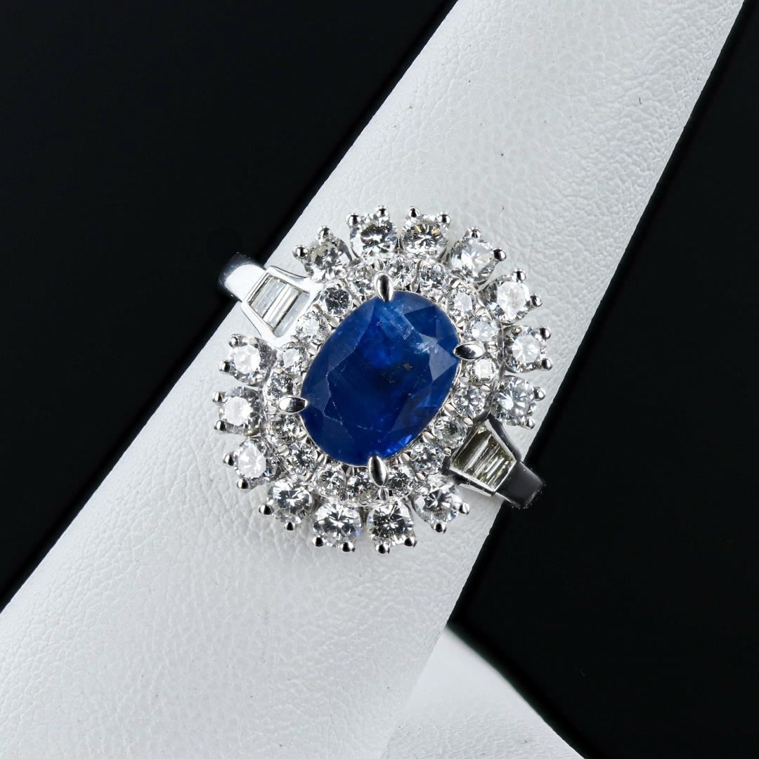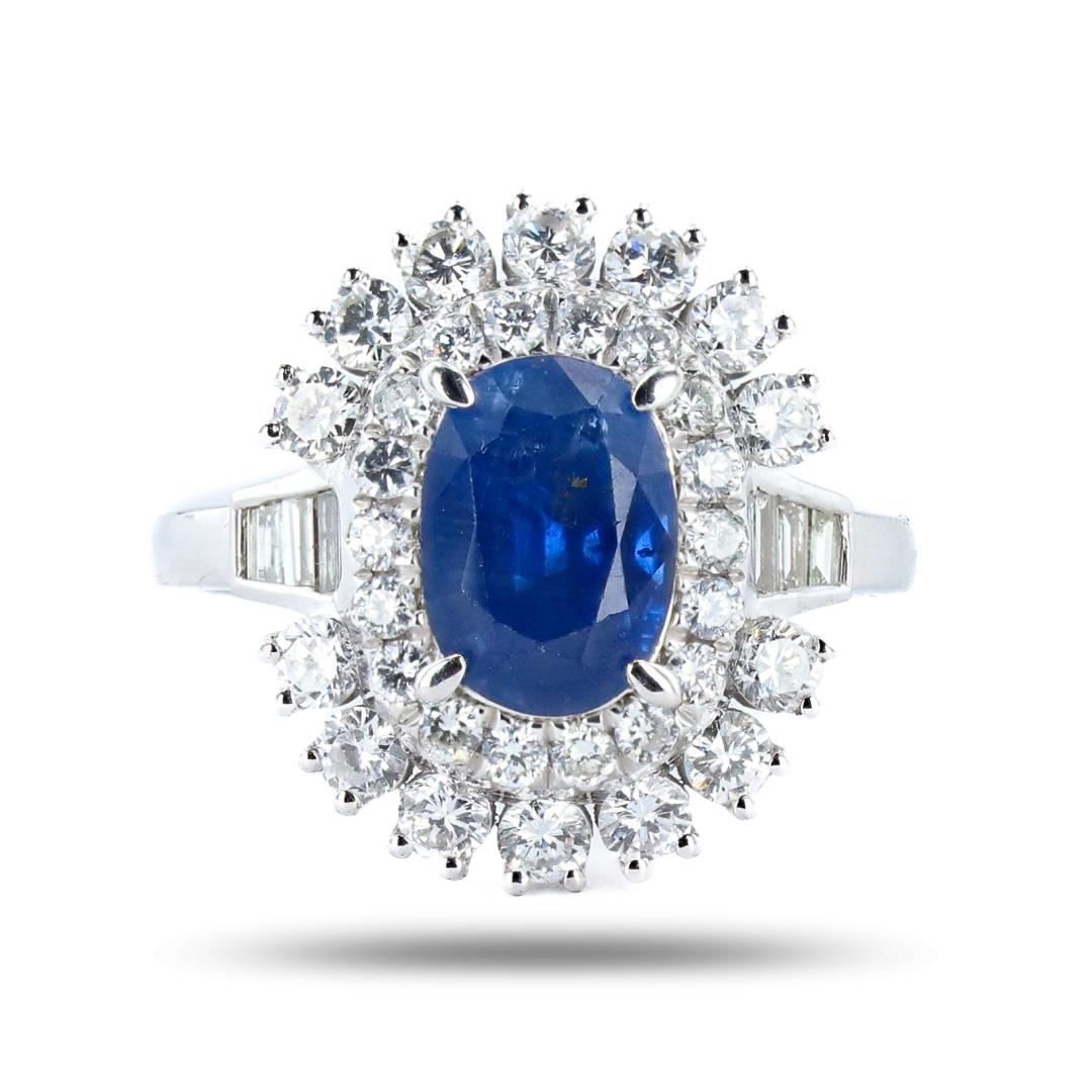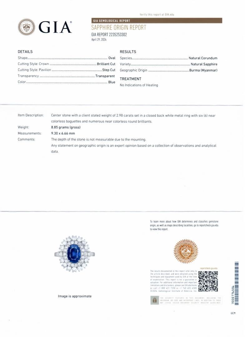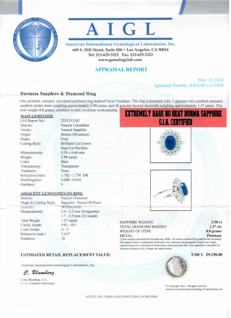 One polished, stamped, and tested platinum ring marked Oscar Friedman. The ring is mounted with: 1 genuine GIA certified unheated sapphire center stone weighing approximately 2.98 carats, and 38 genuine faceted diamonds weighing approximately 1.37 carats. This item weighs 8.8 grams, condition is new, excellent workmanship. #MAIN GEMSTONE# GIA Report No.: 2235253302; Species: Natural Corundum; Variety: Natural Sapphire; Origin: Burma (Myanmar); Shape: Oval; Cutting Style: Brilliant Cut Crown, Step Cut Pavilion; Measurements: 9.30 x 6.66mm; Weight: 2.98 carats; Color: Blue; Transparency: Transparent; Treatment: None; Refractive Index: 1.762 - 1.770 DR; Birefringence: 0.008 - 0010; Hardness: 9 #ADJACENT GEMSTONES ON RING# Identity: Natural Diamond; Shape & Cutting Style: Baguette / Round Brilliant; Quantity: 28 Diamonds; Measurements: 2.0 - 2.5mm (6 baguette), 1.7 - 2.5mm (32 round); Total Weight: 1.37 carats; Clarity Grade: VS1-SI1; Color Grade: G-I; Refractive Index: 2.417; Hardness: 10; SAPPHIRE WEIGHT: 2.98 ct; TOTAL DIAMOND WEIGHT: 1.37 cts; WEIGHT OF ITEM: 8.8 grams; METAL: Platinum #Size: 7