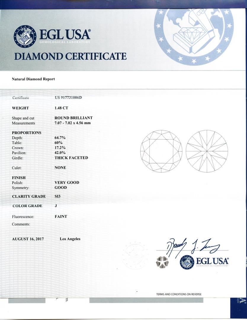 ONE 18K WHITE GOLD LADY'S CUSTOM MADE LADY'S PAIR OF DIAMOND STUD STYLE EARRINGS . SCREW BACKINGS #1 - MAIN CENTER GEMSTONE(S)# IDENTITY: TWO CENTER NATURAL DIAMONDS SET IN 4 PRONGS SETTING STYLE; CARAT WEIGHT: 2.99 CTS TW FOR THE PAIR; SHAPE , MEASUREIVIEMT and QUALITY: (1) - ONE ROUND BRILLIANT CUT TW: 1.51 CTS, I COLOR, SI3 CLARITY, EGL REPORT #US 919436116D; (2) - ONE ROUND BRILLIANT CUT TW: 1.48 CTS, J COLOR, SI3 CLARITY, EGL REPORT #US 917731006D; TOTAL DIAMONDS WEIGHT: 2.99 CTS