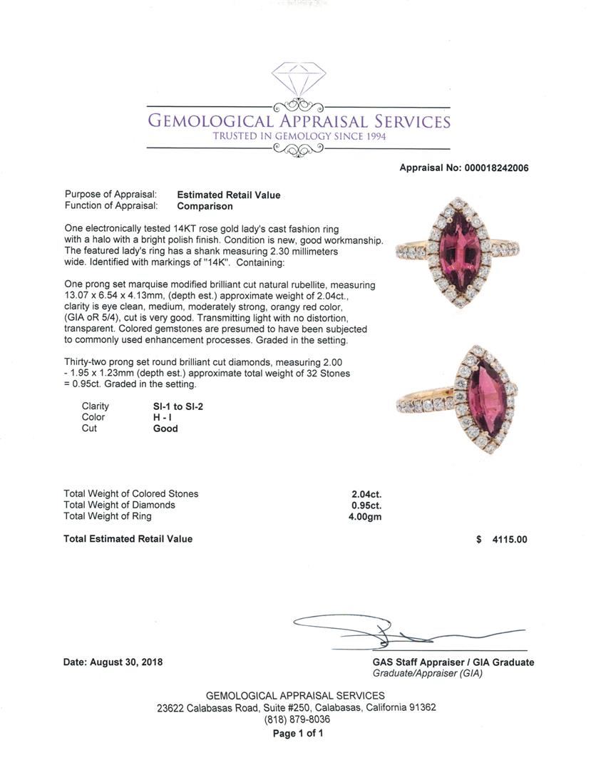 One electronically tested 14KT rose gold lady's cast fashion ring with a halo with a bright polish finish. The featured lady's ring has a shank measuring 2.30 millimeters wide. Identified with markings of '14K'. Condition is new, good workmanship. Containing: One prong set marquise modified brilliant cut natural rubellite, measuring 13.07 x 6.54 x 4.13mm, (depth est.) approximate weight of 2.04ct., clarity is eye clean, medium, moderately strong, orangy red color, (GIA oR 5/4), cut is very good. Transmitting light with no distortion, transparent. Colored gemstones are presumed to have been subjected to commonly used enhancement processes. Graded in the setting. Thirty-Two prong set round brilliant cut diamonds, measuring 2.00 - 1.95 x 1.23mm (depth est.) approximate total weight of 32 Stones = 0.95ct. Graded in the setting. Color H - I Clarity SI-1 to SI-2 Cut Good. Total Weight of Colored Stones 2.04ct.. Total Weight of Diamonds 0.95ct.. Total Weight of Ring 4.00gm GAS Appraised at $4115.00. GAS Appraised.