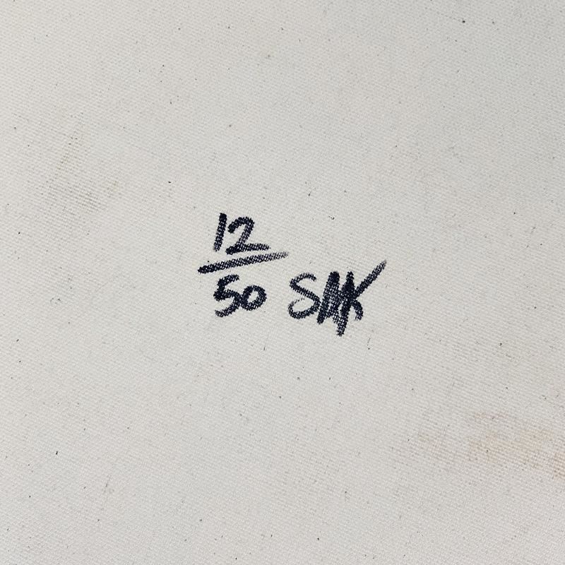 "2 Dollar Bill" is a limited edition hand pulled silkscreen mixed media on canvas by Andy Warhol protege Steve Kaufman (1960-2010). This piece is numbered and hand signed inverso and includes a letter of authenticity. As is common with Kaufman's works, this piece may have perceived minor flaws and creases. Measures approximately 18" x 34" (image).