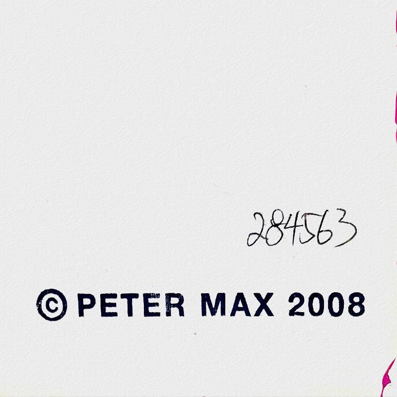 "2 Liberties, Flag and Heart" is a one-of-a-kind mixed media on paper, hand signed by Peter Max. The piece comes custom framed with a backside cutout to display Peter Max Studio registration number 284563 certifying authenticity. Measures approximately 28" x 24" (frame), 19" x 15" (image).
