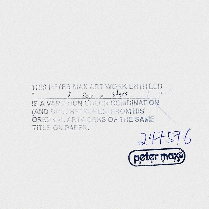 "2 Sages with Stars" is a one-of-a-kind mixed media on paper, hand signed by Peter Max. The piece comes custom framed with a backside cutout to display Peter Max Studio registration number 247576 certifying authenticity. Measures approximately 28" x 24" (frame), 19" x 15" (image). This item requires special handling and may have a longer than usual turnaround.