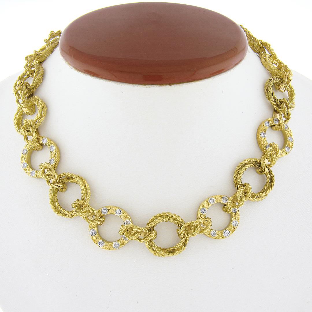 A vintage solid 18k yellow gold twisted wire link set of 2 bracelets or necklace, featuring 32 round brilliant cut natural diamonds (G/H - VS2/SI1 ; 2.56ctw ). It weighs a total of 90.50 grams, measures 18mm wide, and measures each 6.75 inches in length.
