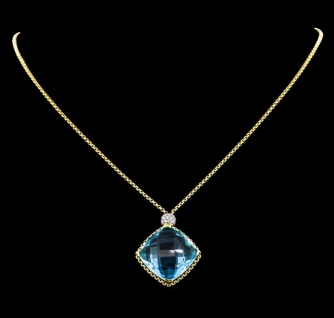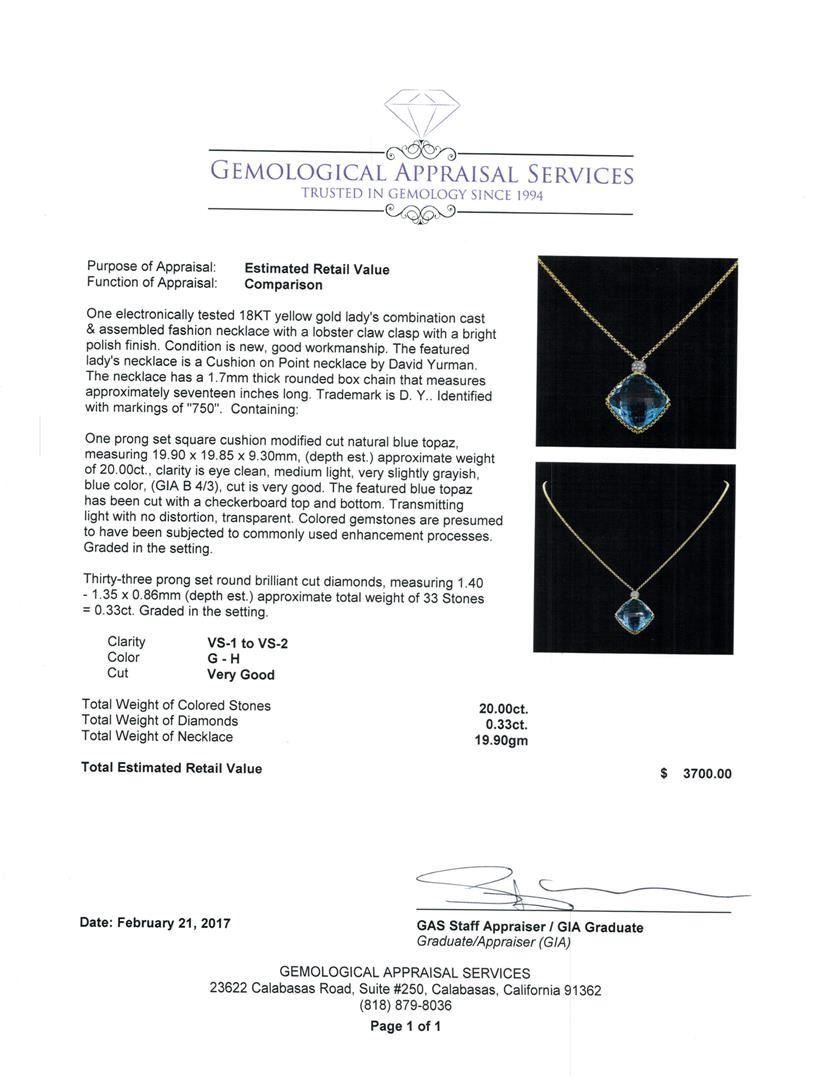One electronically tested 18KT yellow gold lady's combination cast & assembled fashion necklace with a lobster claw clasp with a bright polish finish. The featured lady's necklace is a Cushion on Point necklace by David Yurman. The necklace has a 1.7mm thick rounded box chain that measures approximately seventeen inches long. Trademark is D. Y. Identified with markings of '750'. Condition is new, good workmanship. Containing: One prong set square cushion modified cut natural blue topaz, measuring 19.90 x 19.85 x 9.30mm, (depth est.) approximate weight of 20.00ct., clarity is eye clean, medium light, very slightly grayish, blue color, (GIA B 4/3), cut is very good. The featured blue topaz has been cut with a checkerboard top and bottom. Transmitting light with no distortion, transparent. Colored gemstones are presumed to have been subjected to commonly used enhancement processes. Graded in the setting. Thirty-Three prong set round brilliant cut diamonds, measuring 1.40 - 1.35 x 0.86mm (depth est.) approximate total weight of 33 Stones = 0.33ct. Graded in the setting. Clarity VS-1 to VS-2. Color: G - H Cut Very Good. Total Weight of Colored Stones 20.00ct.. Total Weight of Diamonds 0.33ct.. Total Weight of Necklace 19.90gm GAS Appraised at $3,700.00.