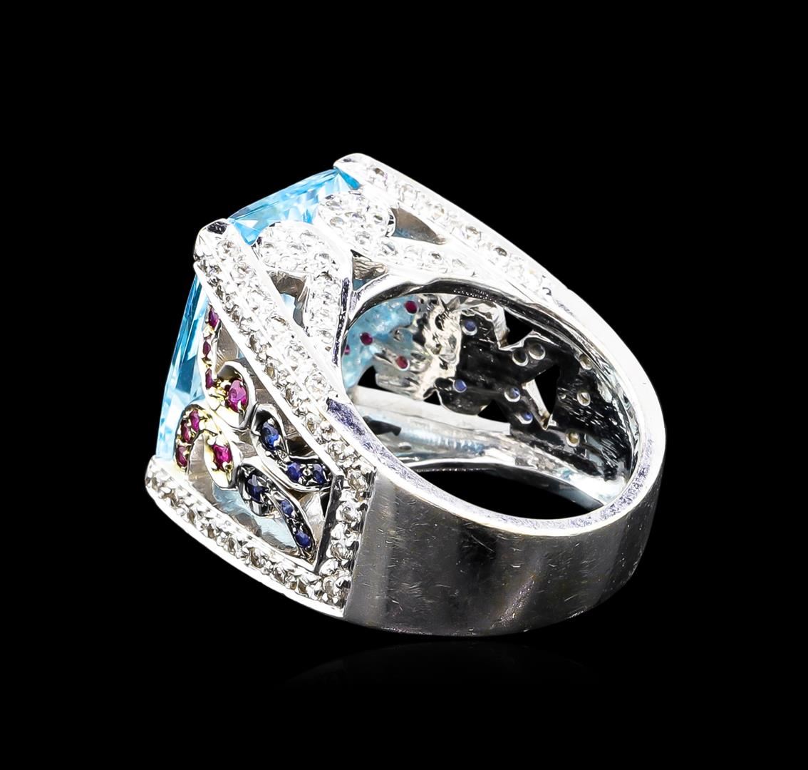 One ring featuring: 14KT white gold weighing 20.51 grams containing one blue topaz with a total weight of 20.00ct, blue sapphires with a total weight of 0.15ct, rubies with a total weight of 0.16, and side diamonds with a total weight of 1.05ct.