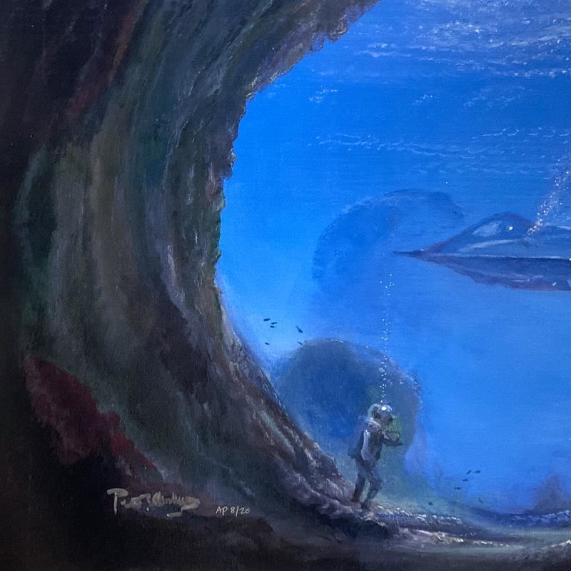 "20,000 Leagues" is a limited edition giclee on canvas by Peter (1913-2007) and Harrison Ellenshaw, AP numbered 8/20 and hand signed by the artists. This piece is licensed by Disney Fine Art. Includes Letter of Authenticity. Measures approx. 18" x 36" (image). There is a very small imperfection on the bottom-right edge of the image (wear on the varnish) that is only visible upon close inspection from certain angles. There is also a faint horizontal crease on the image that may be concealed when the piece is stretched and framed.