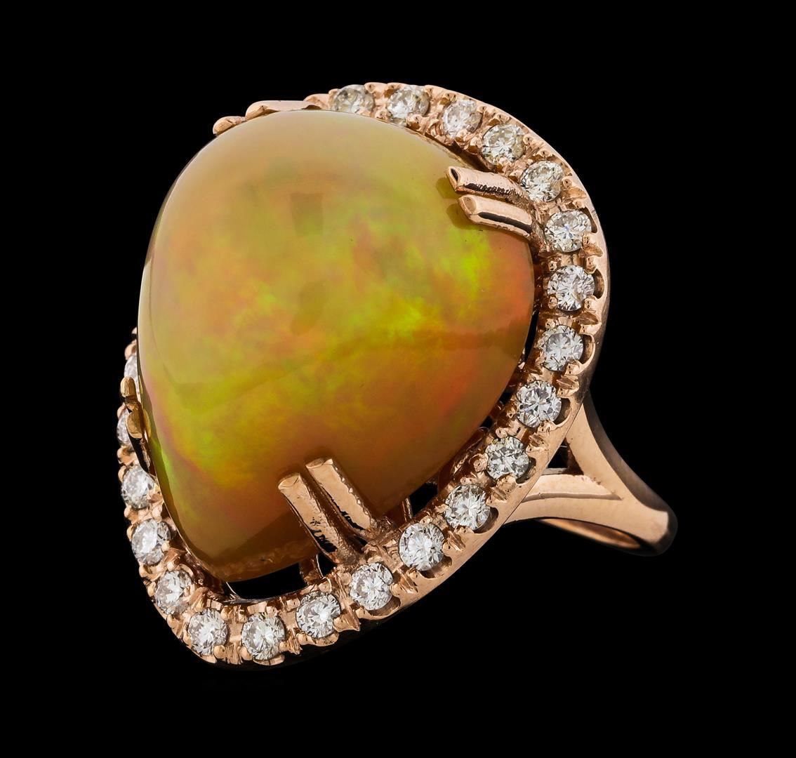 One electronically tested 14KT rose gold lady's cast fashion ring with a split shank halo with a bright polish finish. The featured lady's ring has a shank measuring 2.10 millimeters wide. Identified with markings of '14K'. Condition is new, good workmanship. Containing: One orange crystal that is cut in a pear shaped cabochon and is unset, measuring 20.86 mm long x 17.35 mm wide, and 12.60 mm thick and the approximate weight is 20.05 carats. The opal has a somewhat bright, multicolor play of color (fire) in a rolling flashfire pattern; a high dome; a good cut; no inclusions; consistent in its brightness and pattern; and is not directional. Graded in the setting. Twenty-Six prong set round brilliant cut diamonds, measuring 2.10 - 2.05 x 1.29mm (depth est.) approximate total weight of 26 Stones = 0.88ct. Graded in the setting. Clarity VS-2 to SI-2. Color: H - I Cut Good. Total Weight of Diamonds 0.88ct.. Total Weight of Opals 20.05ct.. Total Weight of Ring 13.20gm. GAS Appraised at $9,070.00.