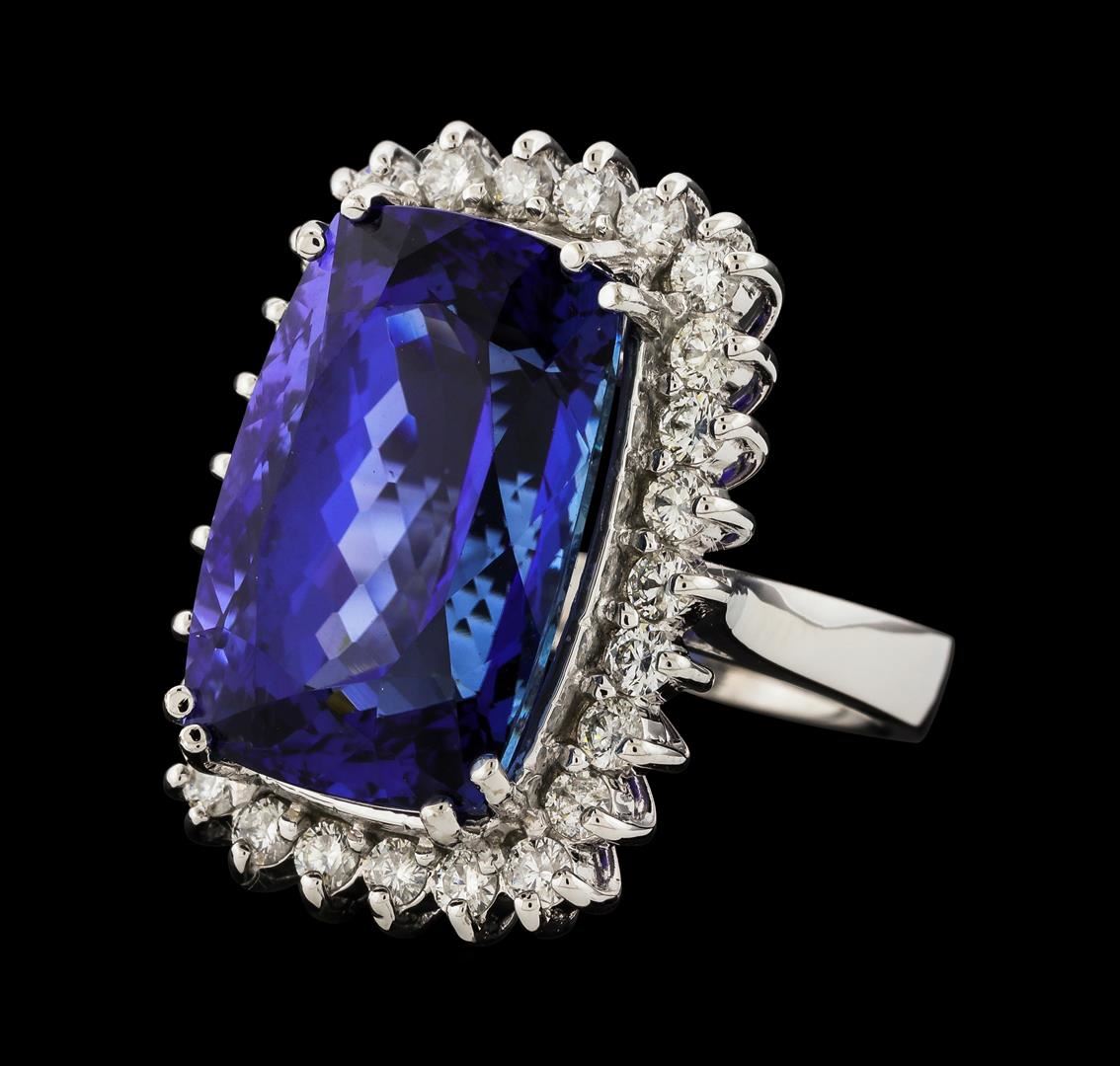 One electronically tested 14KT white gold lady's cast fashion ring with a basket halo with a bright polish finish. The featured lady's ring has a shank measuring 3.56 millimeters wide. Identified with markings of 'K14'. Condition is new, good workmanship. Containing: One prong set rectangular cushion modified brilliant cut natural tanzanite, measuring 18.38 x 12.22 x 10.36mm, (depth est.) 11%. bulge factor, approximate weight of 20.39ct., clarity is eye clean, medium dark, strong, violetish blue color, (GIA vB 6/5), cut is very good. Transmitting light with no distortion, transparent. Colored gemstones are presumed to have been subjected to commonly used enhancement processes. Graded in the setting. Twenty-Six prong set round brilliant cut diamonds, measuring 2.25 - 2.15 x 1.36mm (depth est.) approximate total weight of 26 Stones = 1.05ct. Graded in the setting. Clarity SI-1 to SI-2. Color: H - I Cut Good. Total Weight of Colored Stones 20.39ct.. Total Weight of Diamonds 1.05ct.. Total Weight of Ring 13.70gm. GAS Appraised at $29,720.00.