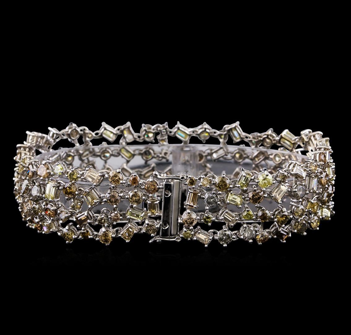 One electronically tested 18KT white gold ladies custom cast & assembled diamond bracelet with a bright polish finish. Seven inch length bracelet features a three-quarter inch wide flexible intricately woven diamond ribbon, terminating in a barrel style clasp with twin safeties. Identified with markings of "18K 750". Condition is good. Containing: One Hundred Five prong set round brilliant cut diamonds, measuring 3.70 - 2.30 x 1.80mm (depth est.) approximate total weight of 105 Stones = 14.14ct. The group is composed of a mix of natural and laboratory irradiated enhanced light brown, light pinkish brown, fancy brown, light yellow, fancy yellow and fancy greenish yellow color diamonds. Graded in the setting. Clarity: SI-2 to I-2 Fifty-Six prong set baguette cut diamonds, measuring from 3.30 x 2.20 x 1.54mm (depth est.) to 4.00 x 2.10 x 1.47mm (depth est.) approximate total weight of 56 Stones = 6.14ct. The group is composed of a mix of natural and laboratory irradiated enhanced light brown, light pinkish brown, fancy brown, light yellow, fancy yellow and fancy greenish yellow color diamonds. Graded in the setting. Clarity: VS-2 to SI-2 Two prong set triangle brilliant cut diamonds, measuring 2.50 x 2.40 x 1.49mm (depth est.) approximate total weight of 2 Stones = 0.12ct. The pair is composed of a mix of laboratory irradiated enhanced fancy yellow and fancy dark greenish yellow color diamonds. Graded in the setting. Clarity: SI-2 to I-1. Total Weight of Diamonds 20.40ct. Total Weight of Bracelet 32.95gm. AIG Appraised at $57,575.00.