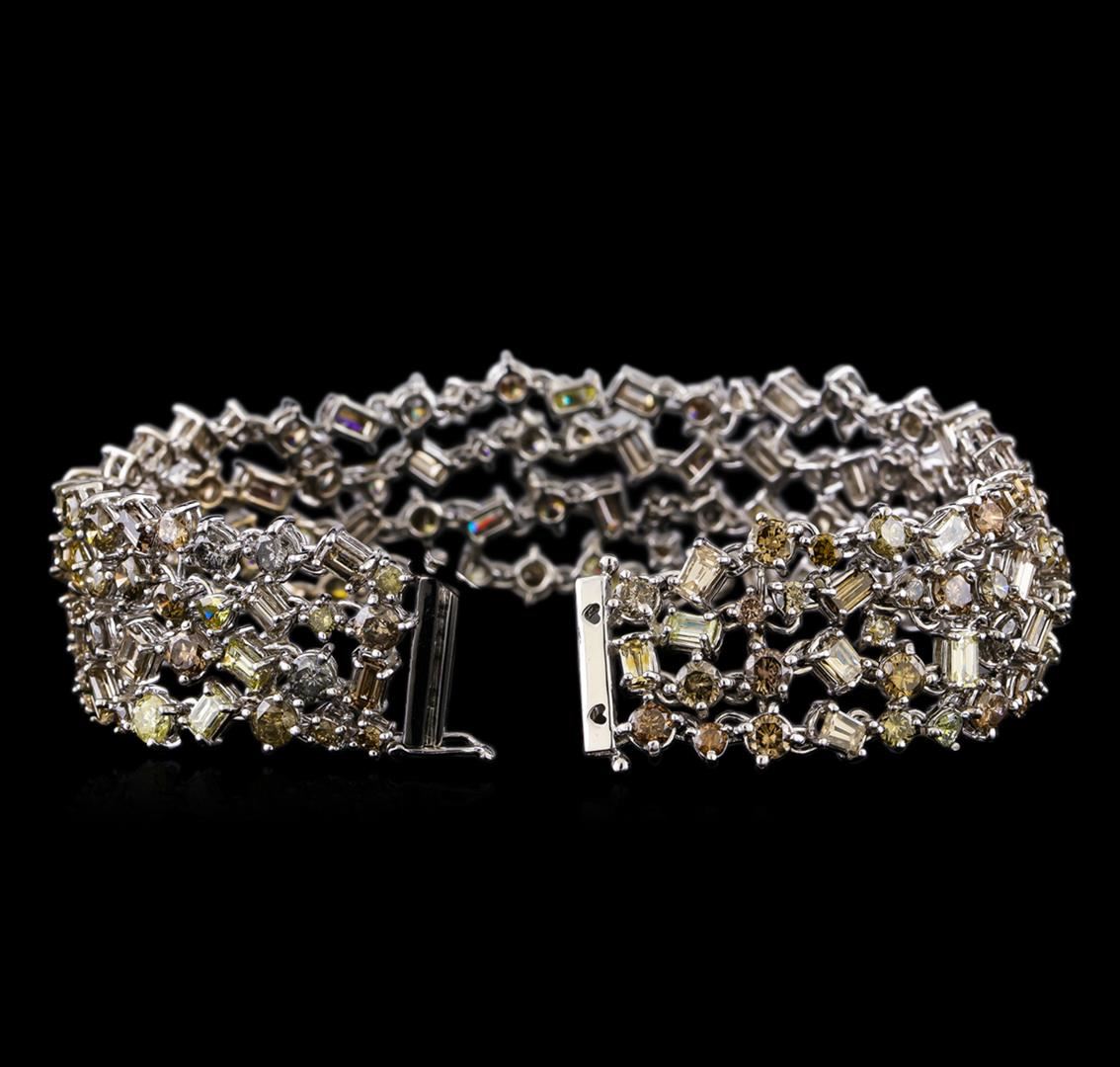 One electronically tested 18KT white gold ladies custom cast & assembled diamond bracelet with a bright polish finish. Seven inch length bracelet features a three-quarter inch wide flexible intricately woven diamond ribbon, terminating in a barrel style clasp with twin safeties. Identified with markings of "18K 750". Condition is good. Containing: One Hundred Five prong set round brilliant cut diamonds, measuring 3.70 - 2.30 x 1.80mm (depth est.) approximate total weight of 105 Stones = 14.14ct. The group is composed of a mix of natural and laboratory irradiated enhanced light brown, light pinkish brown, fancy brown, light yellow, fancy yellow and fancy greenish yellow color diamonds. Graded in the setting. Clarity: SI-2 to I-2 Fifty-Six prong set baguette cut diamonds, measuring from 3.30 x 2.20 x 1.54mm (depth est.) to 4.00 x 2.10 x 1.47mm (depth est.) approximate total weight of 56 Stones = 6.14ct. The group is composed of a mix of natural and laboratory irradiated enhanced light brown, light pinkish brown, fancy brown, light yellow, fancy yellow and fancy greenish yellow color diamonds. Graded in the setting. Clarity: VS-2 to SI-2 Two prong set triangle brilliant cut diamonds, measuring 2.50 x 2.40 x 1.49mm (depth est.) approximate total weight of 2 Stones = 0.12ct. The pair is composed of a mix of laboratory irradiated enhanced fancy yellow and fancy dark greenish yellow color diamonds. Graded in the setting. Clarity: SI-2 to I-1. Total Weight of Diamonds 20.40ct. Total Weight of Bracelet 32.95gm. AIG Appraised at $57,575.00.