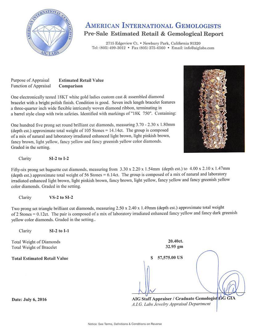 One electronically tested 18KT white gold ladies custom cast & assembled diamond bracelet with a bright polish finish. Seven inch length bracelet features a three-quarter inch wide flexible intricately woven diamond ribbon, terminating in a barrel style clasp with twin safeties. Identified with markings of "18K 750". Condition is good. Containing: One Hundred Five prong set round brilliant cut diamonds, measuring 3.70 - 2.30 x 1.80mm (depth est.) approximate total weight of 105 Stones = 14.14ct. The group is composed of a mix of natural and laboratory irradiated enhanced light brown, light pinkish brown, fancy brown, light yellow, fancy yellow and fancy greenish yellow color diamonds. Graded in the setting. Clarity: SI-2 to I-2 Fifty-Six prong set baguette cut diamonds, measuring from 3.30 x 2.20 x 1.54mm (depth est.) to 4.00 x 2.10 x 1.47mm (depth est.) approximate total weight of 56 Stones = 6.14ct. The group is composed of a mix of natural and laboratory irradiated enhanced light brown, light pinkish brown, fancy brown, light yellow, fancy yellow and fancy greenish yellow color diamonds. Graded in the setting. Clarity: VS-2 to SI-2 Two prong set triangle brilliant cut diamonds, measuring 2.50 x 2.40 x 1.49mm (depth est.) approximate total weight of 2 Stones = 0.12ct. The pair is composed of a mix of laboratory irradiated enhanced fancy yellow and fancy dark greenish yellow color diamonds. Graded in the setting. Clarity: SI-2 to I-1. Total Weight of Diamonds 20.40ct. Total Weight of Bracelet 32.95gm. AIG Appraised at $57,575.00.