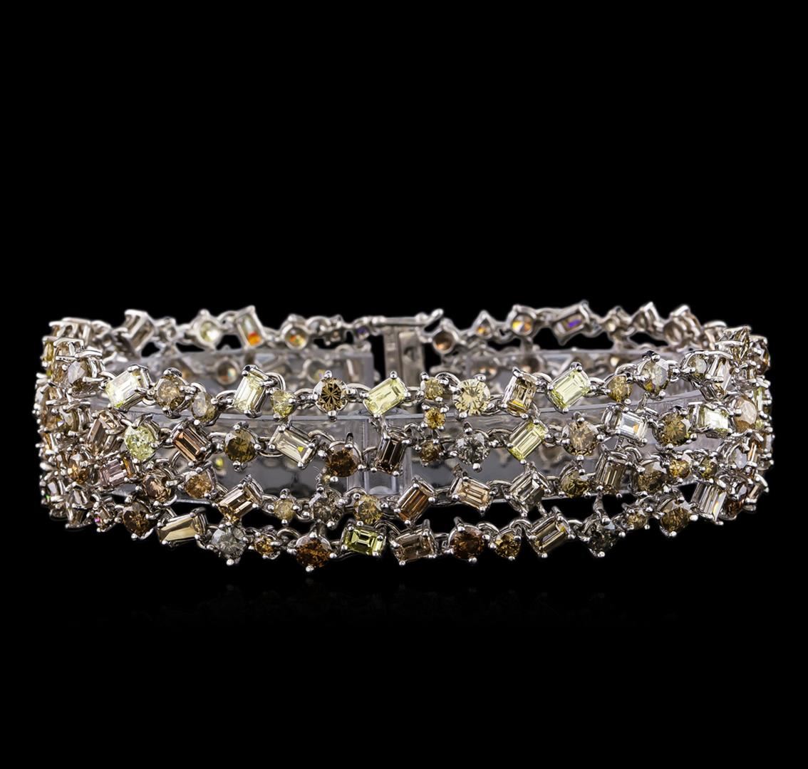 One electronically tested 18KT white gold ladies custom cast & assembled diamond bracelet with a bright polish finish. Seven inch length bracelet features a three-quarter inch wide flexible intricately woven diamond ribbon, terminating in a barrel style clasp with twin safeties. Identified with markings of "18K 750". Condition is good. Containing: One Hundred Five prong set round brilliant cut diamonds, measuring 3.70 - 2.30 x 1.80mm (depth est.) approximate total weight of 105 Stones = 14.14ct. The group is composed of a mix of natural and laboratory irradiated enhanced light brown, light pinkish brown, fancy brown, light yellow, fancy yellow and fancy greenish yellow color diamonds. Graded in the setting. Clarity: SI-2 to I-2 Fifty-Six prong set baguette cut diamonds, measuring from 3.30 x 2.20 x 1.54mm (depth est.) to 4.00 x 2.10 x 1.47mm (depth est.) approximate total weight of 56 Stones = 6.14ct. The group is composed of a mix of natural and laboratory irradiated enhanced light brown, light pinkish brown, fancy brown, light yellow, fancy yellow and fancy greenish yellow color diamonds. Graded in the setting. Clarity: VS-2 to SI-2 Two prong set triangle brilliant cut diamonds, measuring 2.50 x 2.40 x 1.49mm (depth est.) approximate total weight of 2 Stones = 0.12ct. The pair is composed of a mix of laboratory irradiated enhanced fancy yellow and fancy dark greenish yellow color diamonds. Graded in the setting. Clarity: SI-2 to I-1. Total Weight of Diamonds 20.40ct. Total Weight of Bracelet 32.95gm. AIG Appraised at $57,575.00.
