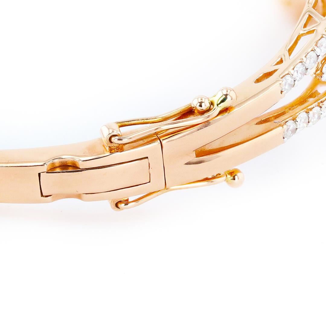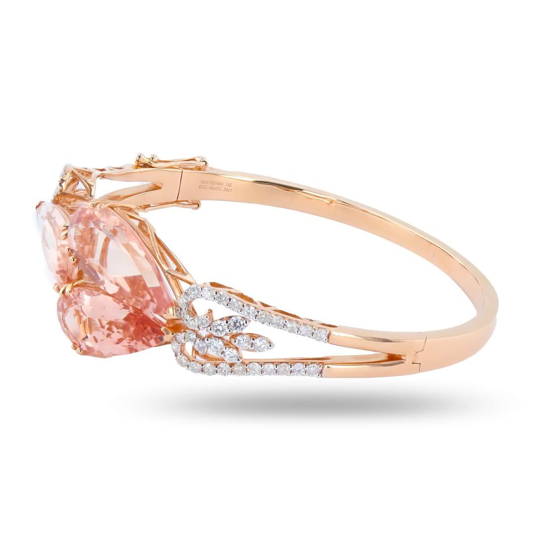 Name of Article: Lady's Morganite & Diamond Bangle Setting: 14 Kt. Rose Gold Mounting [26.10 gms] #Additional Stones/Information:# 68 Round Diamonds = Approx. 1.54 Cts. TWT (Color: H-I, Clarity: SI2-I2) #Center Gemstone Information:# SPECIES: Natural Beryl VARIETY: Morganite SHAPE AND CUT: Pear Mixed Cut Weight: 3 = 20.46 Carats TW Measurements: 21.65 x 9.43 x 7.06mm (Avg.) COLOR HUE: Orangy Pink SATURATION: Moderate TRANSPARENCY: Transparent #COMMENTS:# Value Based on Full Retail MSRP, Graded As Mounting Permits, Natural Morganites Are Typically Heated/Irradiated to Improve Color and Saturation, Diamond Quality is Expressed As An Average, Stamped: OSCAR FRIEDMAN 14K MO20 46ct D1.54ct Size: 7
