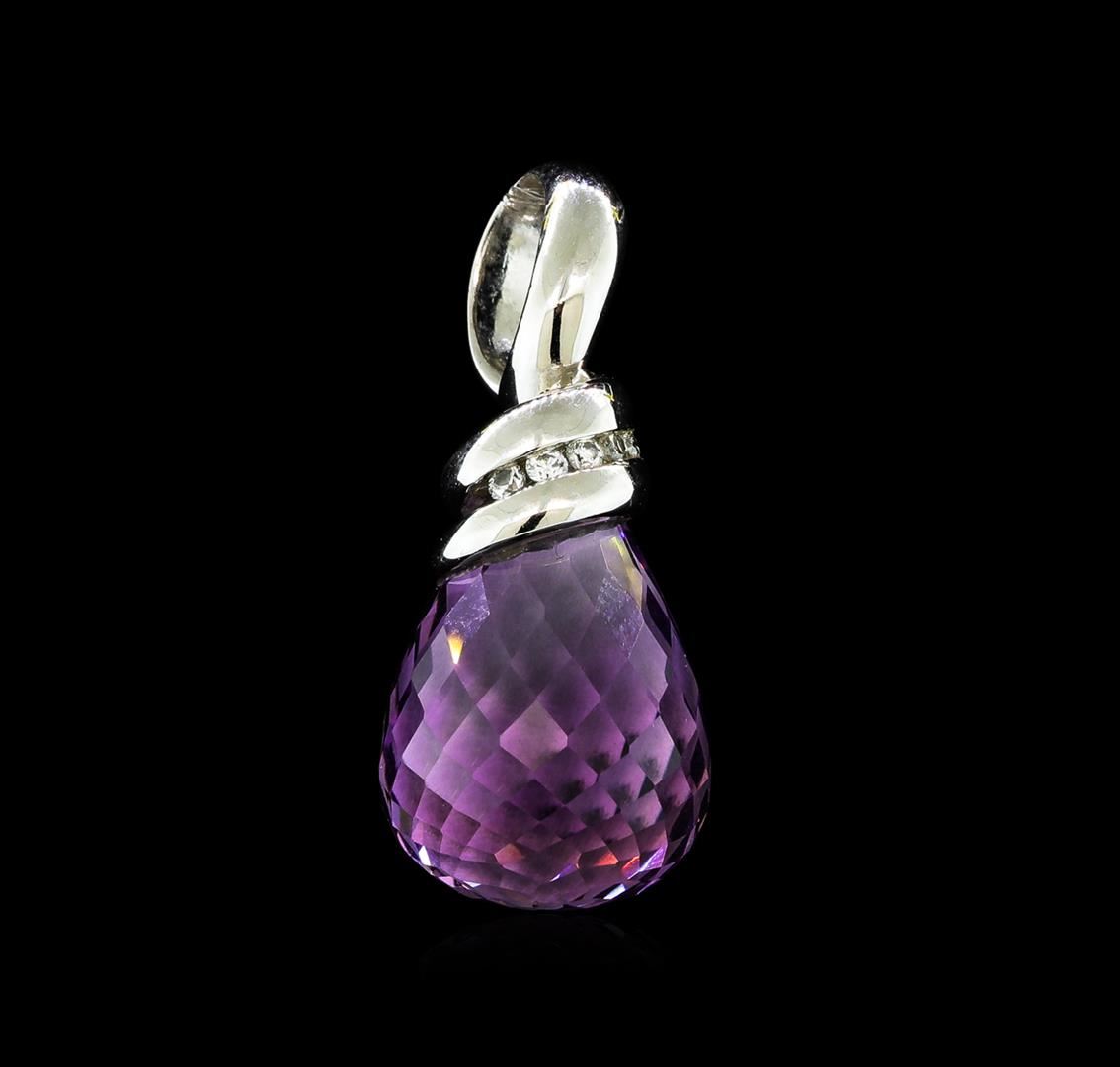 One electronically tested 14KT white gold lady's combination cast & assembled fashion pendant with a bright polish finish. The featured lady's pendant has a diamond set spiral bail and a total length of 30.5 millimeters. Identified with markings of '14K'. Condition is new, good workmanship. Containing: One inlay set briolette standard cut natural amethyst, measuring 19.00 x 13.00 x 13.00mm, (depth est.) 9%. bulge factor, approximate weight of 20.50ct., clarity is eye clean, light, moderately strong, purple color, (GIA P 3/4), cut is very good. Transmitting light with no distortion, transparent. Colored gemstones are presumed to have been subjected to commonly used enhancement processes. Graded in the setting. Six channel set round brilliant cut diamonds, measuring 1.60 - 1.55 x 0.98mm (depth est.) approximate total weight of 6 Stones = 0.09ct. Graded in the setting. Clarity SI-1 to SI-2. Color: G - H Cut Good. Total Weight of Colored Stones 20.50ct.. Total Weight of Diamonds 0.09ct.. Total Weight of Pendant 6.50gm GAS Appraised at $1,920.00.