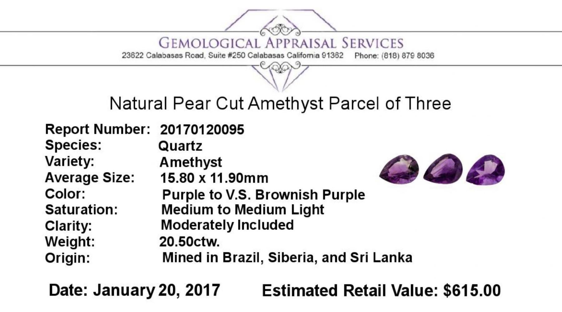One natural pear cut amethyst parcel of three with an exact weight of 20.50 ctw., clarity is moderately included, purple to v.s. brownish purple, medium to medium light. Gemological Appraisals Services estimates the retail value at $615 GAS Appraised.