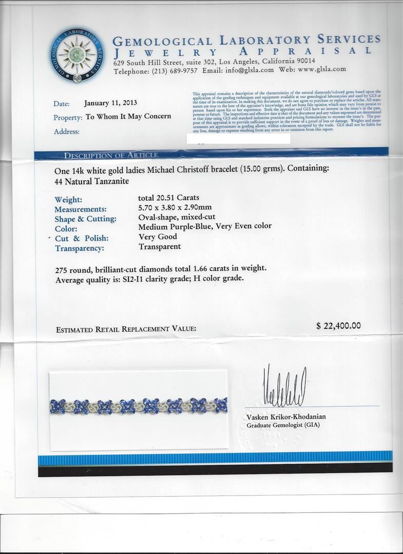 One 14KT white gold ladies Michael Christoff bracelet weighing a total of 15.00 grams. Containing: 44 Natural Tanzanites: Weight: Total 20.51ct. Measurements: 5.70 x 3.80 x 2.90mm. Shape & Cutting: Oval-shaped, mixed-cut. Color: Medium purple-blue, very even color. Cut & Polish: Very good. Transparency: Transparent. The tanzanites are complemented by 275 round, brilliant-cut diamonds with a total weight of 1.66ct. Clarity Grade: SI2 - I1. Color Grade: H. GLS Appraised at $22,400.00.
