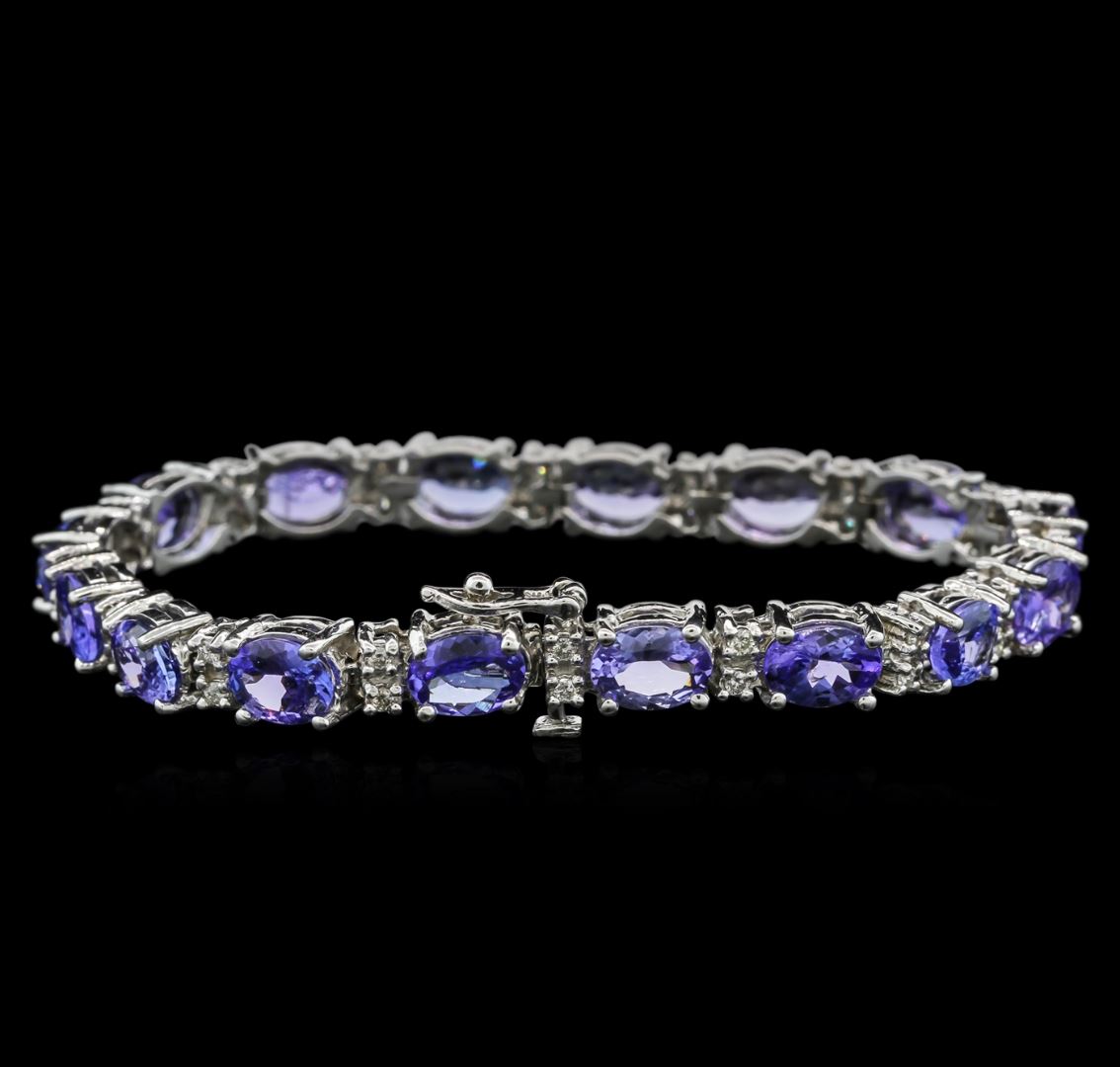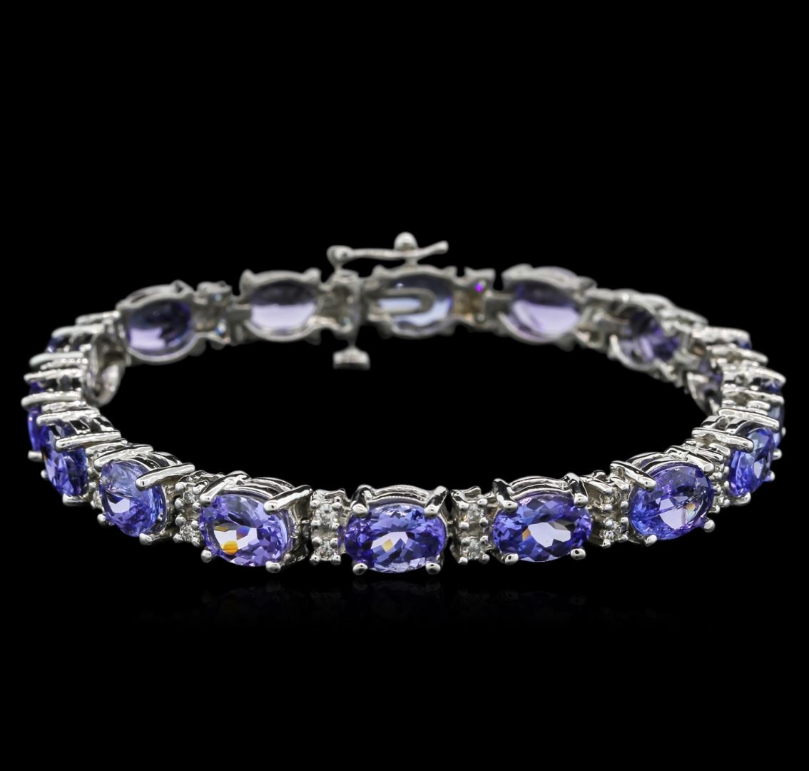 One electronically tested 14KT white gold ladies cast & assembled tanzanite and diamond bracelet. Seven inch length bracelet features a flexible tanzanite and diamond duo ribbon, terminating in a concealed clasp with safety. Bright polish finish. Identified with markings of "14K". Condition is new, good workmanship. Containing: Sixteen prong set oval mixed cut natural tanzanites, measuring 8.00 x 6.00 x 3.80mm, approximate total weight of 20.58ct., clarity is eye clean, type I, medium dark, very slightly grayish, bluish violet color, (GIA bV 6/3), cut is good. Transmitting light with no distortion, transparent. Measurements & the color grade are an average for the group. Graded in the setting. Tanzanite is a very rare gemstone that is only found in the country of Tanzania. Originally discovered in 1967. Tiffany & Company, named the stone Tanzanite. It is found in the Usumburu Mountains that border the Umba Valley of northern Tanzania. Tanzanite occurs in gray, brown, violet, blue, reddish-purple, & green. The gem is interesting because of its exceptional pleochroism. Rotated in different directions a tanzanite will exhibit multiple changes of color. Tanzanite has a low tolerance to ultrasonic cleaning, and should not be cleaned using this method. Thirty-Two prong set round brilliant cut diamonds, measuring 1.80 - 1.70 x 1.05mm approximate total weight of 32 Stones = 0.72ct. Graded in the setting. Clarity: SI-1 to SI-2. Color: H - J. Total Weight of Colored Stones 20.58ct. Total Weight of Diamonds 0.72ct. Total Weight of Bracelet 22.45gm. AIG Appraised at $18,230.00.