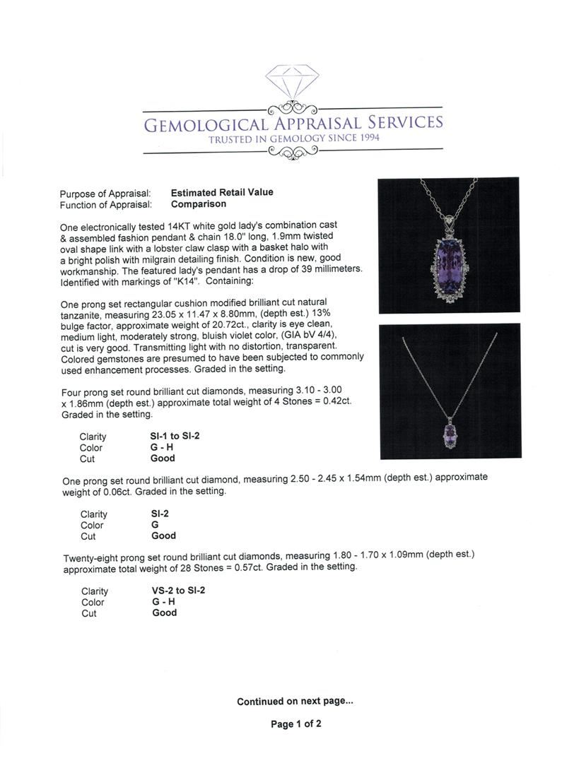 One electronically tested 14KT white gold lady's combination cast & assembled fashion pendant & chain 18.0' long, 1.9mm twisted oval shape link with a lobster claw clasp with a basket halo with a bright polish with milgrain detailing finish. The featured lady's pendant has a drop of 39 millimeters. Identified with markings of 'K14'. Condition is new, good workmanship. Containing: One prong set rectangular cushion modified brilliant cut natural tanzanite, measuring 23.05 x 11.47 x 8.80mm, (depth est.) 13%. bulge factor, approximate weight of 20.72ct., clarity is eye clean, medium light, moderately strong, bluish violet color, (GIA bV 4/4), cut is very good. Transmitting light with no distortion, transparent. Colored gemstones are presumed to have been subjected to commonly used enhancement processes. Graded in the setting. Four prong set round brilliant cut diamonds, measuring 3.10 - 3.00 x 1.86mm (depth est.) approximate total weight of 4 Stones = 0.42ct. Graded in the setting. Clarity SI-1 to SI-2. Color: G - H Cut Good One prong set round brilliant cut diamond, measuring 2.50 - 2.45 x 1.54mm (depth est.) approximate weight of 0.06ct. Graded in the setting. Clarity SI-2. Color: G Cut Good Twenty-Eight prong set round brilliant cut diamonds, measuring 1.80 - 1.70 x 1.09mm (depth est.) approximate total weight of 28 Stones = 0.57ct. Graded in the setting. Clarity VS-2 to SI-2. Color: G - H Cut Good. Total Weight of Colored Stones 20.72ct.. Total Weight of Diamonds 1.05ct.. Total Weight of Pendant & Chain 13.20gm GAS Appraised at $23,325.00.