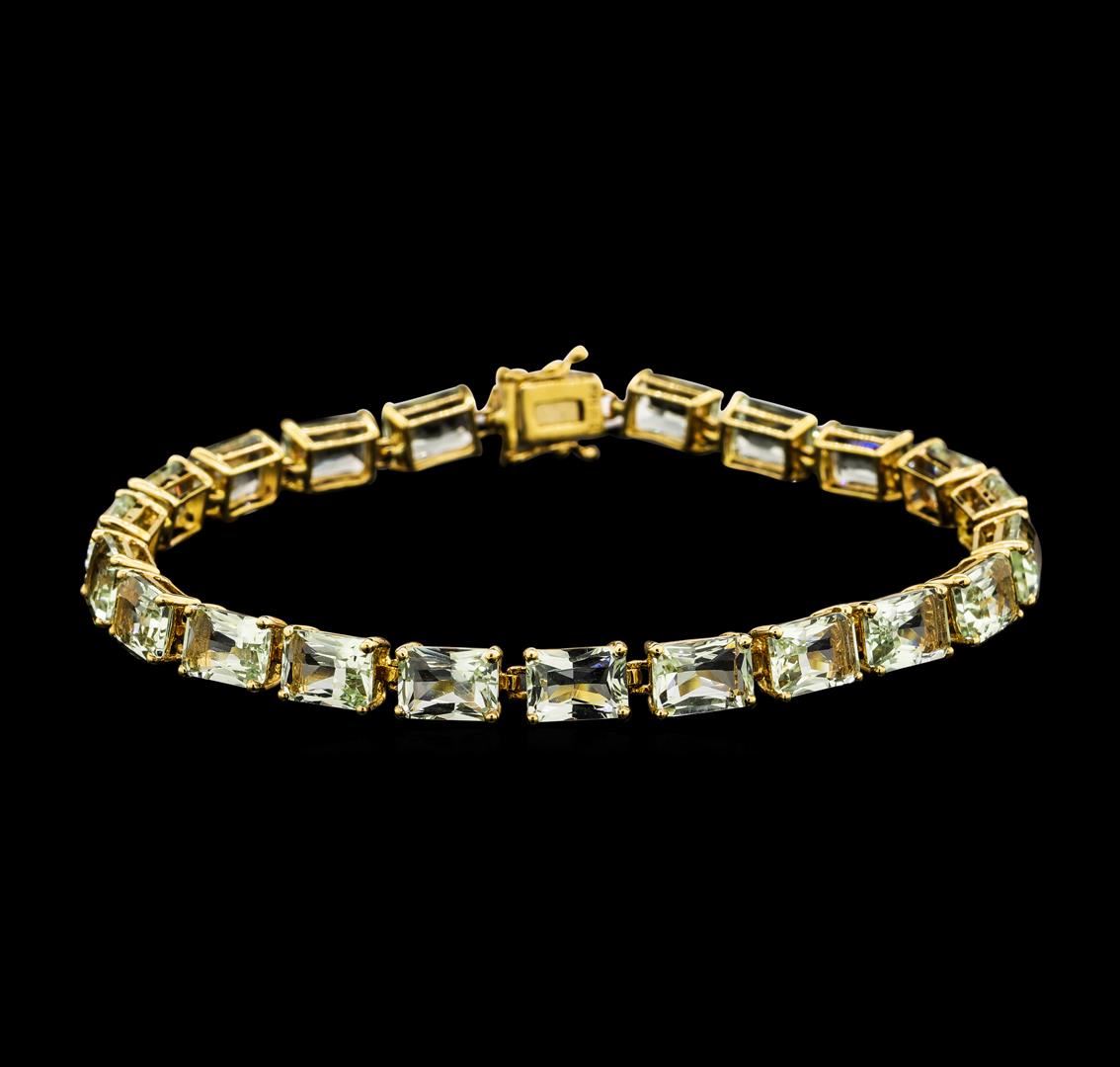 One electronically tested 14KT yellow gold lady's combination cast & assembled fashion bracelet with a tongue clasp with foldover safety with a bright polish finish. The featured lady's bracelet measures approximately 7 inches in length. Identified with markings of '14K'. Condition is new, good workmanship. Containing: Twenty-two prong set rectangular modified brilliant cut natural aquamarines, measuring 6.90 x 4.90 x 3.35mm, (depth est.) approximate total weight of 20.90ct., clarity is eye clean, light, moderately strong, very slightly greenish blue color, (GIA vslgB 3/4), cut is good. Transmitting light with no distortion, transparent. Colored gemstones are presumed to have been subjected to commonly used enhancement processes. Graded in the setting. Total Weight of Colored Stones 20.90ct.. Total Weight of Bracelet 9.90gm GAS Appraised at $3670.00. GAS Appraised at $3,670.00.
