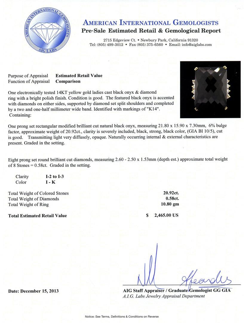 14KT Yellow Gold 20.92ct Black Onyx and Diamond Ring A6492. good Condition! TR855HZ. One electronically tested 14KT yellow gold ladies cast black onyx & diamond ring with a bright polish finish. The featured black onyx is accented with diamonds on either sides, supported by diamond set split shoulders and completed by a two and one-half millimeter wide band. Identified with markings of "K14". Condition is good. Containing: One prong set rectangular modified brilliant cut natural black onyx, measuring 21.80 x 15.90 x 7.30mm, 6%. bulge factor, approximate weight of 20.92ct., clarity is severely included, black, strong, black color, (GIA Bl 10/5), cut is good. Transmitting light very diffusely, opaque. Naturally occurring internal & external characteristics are present. Graded in the setting.Eight prong set round brilliant cut diamonds, measuring 2.60 - 2.50 x 1.53mm (depth est.) approximate. Total Weight of 8 Stones = 0.58ct. Graded in the setting. Clarity: I-2 to I-3 . Color: I - K. Total Weight of Colored Stones 20.92ct.. Total Weight of Diamonds 0.58ct. AIG Appraised at $2,465.00. AIG Appraised.