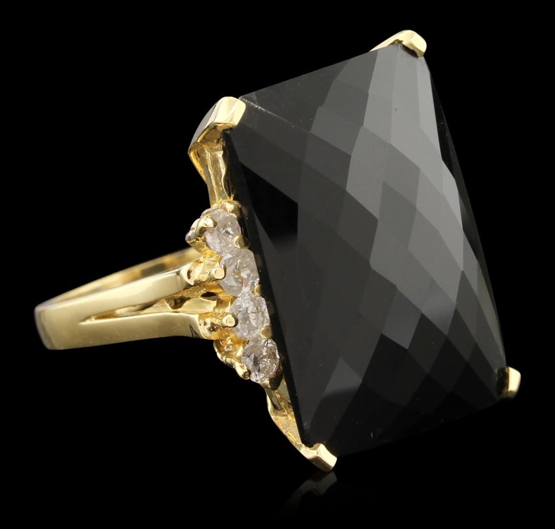 14KT Yellow Gold 20.92ct Black Onyx and Diamond Ring A6492. good Condition! TR855HZ. One electronically tested 14KT yellow gold ladies cast black onyx & diamond ring with a bright polish finish. The featured black onyx is accented with diamonds on either sides, supported by diamond set split shoulders and completed by a two and one-half millimeter wide band. Identified with markings of "K14". Condition is good. Containing: One prong set rectangular modified brilliant cut natural black onyx, measuring 21.80 x 15.90 x 7.30mm, 6%. bulge factor, approximate weight of 20.92ct., clarity is severely included, black, strong, black color, (GIA Bl 10/5), cut is good. Transmitting light very diffusely, opaque. Naturally occurring internal & external characteristics are present. Graded in the setting.Eight prong set round brilliant cut diamonds, measuring 2.60 - 2.50 x 1.53mm (depth est.) approximate. Total Weight of 8 Stones = 0.58ct. Graded in the setting. Clarity: I-2 to I-3 . Color: I - K. Total Weight of Colored Stones 20.92ct.. Total Weight of Diamonds 0.58ct. AIG Appraised at $2,465.00. AIG Appraised.