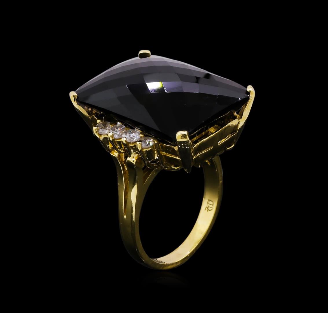 14KT Yellow Gold 20.92ct Black Onyx and Diamond Ring A6492. good Condition! TR855HZ. One electronically tested 14KT yellow gold ladies cast black onyx & diamond ring with a bright polish finish. The featured black onyx is accented with diamonds on either sides, supported by diamond set split shoulders and completed by a two and one-half millimeter wide band. Identified with markings of "K14". Condition is good. Containing: One prong set rectangular modified brilliant cut natural black onyx, measuring 21.80 x 15.90 x 7.30mm, 6%. bulge factor, approximate weight of 20.92ct., clarity is severely included, black, strong, black color, (GIA Bl 10/5), cut is good. Transmitting light very diffusely, opaque. Naturally occurring internal & external characteristics are present. Graded in the setting.Eight prong set round brilliant cut diamonds, measuring 2.60 - 2.50 x 1.53mm (depth est.) approximate. Total Weight of 8 Stones = 0.58ct. Graded in the setting. Clarity: I-2 to I-3 . Color: I - K. Total Weight of Colored Stones 20.92ct.. Total Weight of Diamonds 0.58ct. AIG Appraised at $2,465.00. AIG Appraised.