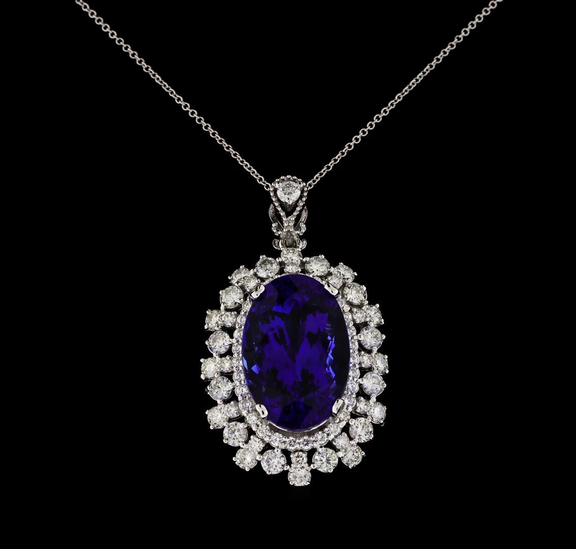 One electronically tested 14KT white gold lady's combination cast & assembled fashion pendant & chain 20.0' long, 1.1mm round cable link with a spring ring clasp with a double basket halo with a bright polish with milgrain detailing finish. Identified with markings of '14K'. Condition is new, good workmanship. Containing: One prong set oval modified brilliant cut natural tanzanite, measuring 20.13 x 13.51 x 10.61mm, (depth est.) 3%. bulge factor, approximate weight of 20.96ct., clarity is eye clean, medium dark, strong, violetish blue color, (GIA vB 6/5), cut is very good. Transmitting light with no distortion, transparent. Colored gemstones are presumed to have been subjected to commonly used enhancement processes. Graded loose prior to setting in the GIA Laboratory, Report #2173847671. Thirteen prong set round brilliant cut diamonds, measuring 3.20 - 3.00 x 1.86mm (depth est.) approximate total weight of 13 Stones = 1.41ct. Graded in the setting. Clarity SI-1 to I-1. Color: H - I Cut Good Twelve prong set round brilliant cut diamonds, measuring 2.80 - 2.70 x 1.71mm (depth est.) approximate total weight of 12 Stones = 0.95ct. Graded in the setting. Clarity SI-1 to SI-2. Color: H - I Cut Good Twelve prong set round brilliant cut diamonds, measuring 1.80 - 1.70 x 1.09mm (depth est.) approximate total weight of 12 Stones = 0.24ct. Graded in the setting. Clarity SI-1 to SI-3. Color: H - I Cut Good Thirty prong set round brilliant cut diamonds, measuring 1.60 - 1.50 x 0.96mm (depth est.) approximate total weight of 30 Stones = 0.42ct. Graded in the setting. Clarity SI-1 to SI-2. Color: H - I Cut Good. Total Weight of Colored Stones 20.96ct.. Total Weight of Diamonds 3.02ct.. Total Weight of Pendant & Chain 12.80gm. GAS Appraised at $32,675.00.