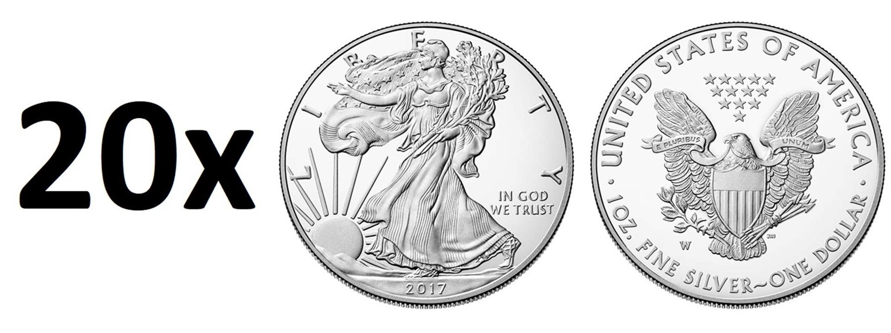 One (20 COUNT) 2017 American Silver Eagle .999 Fine Silver Dollar Coins.