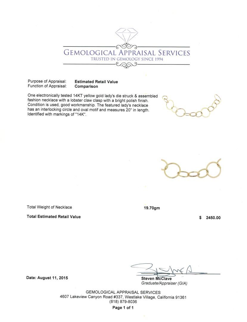 One electronically tested 14KT yellow gold lady's die struck & assembled fashion necklace with a lobster claw clasp with a bright polish finish. The featured lady's necklace has an interlocking circle and oval motif and measures 20" in length. Identified with markings of "14K". Condition is used, good workmanship. Total Weight of Necklace 19.70gm. GAS Appraised at $2,450.00.