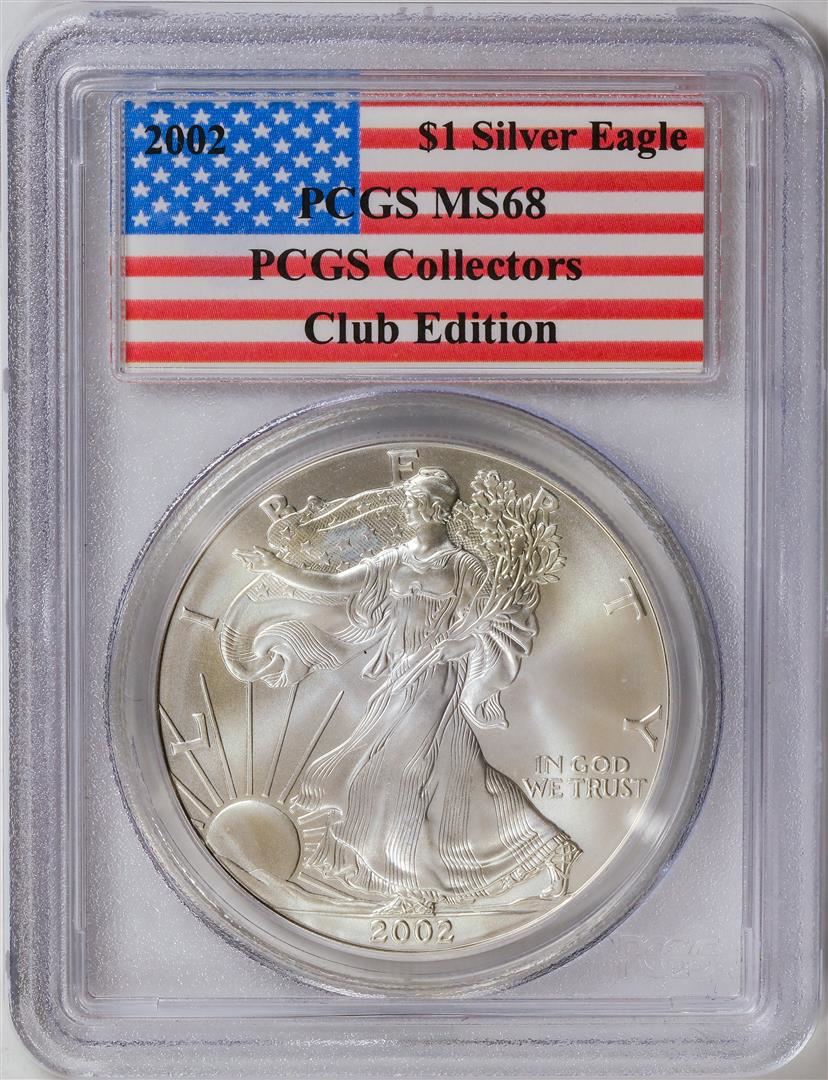 One 2002 American Silver Eagle .999 Fine Silver Dollar Coin PCGS MS68.