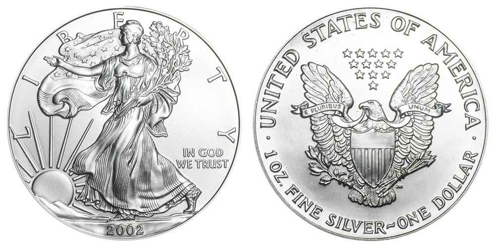 One 2002 American Silver Eagle .999 Fine Silver Dollar Coin.