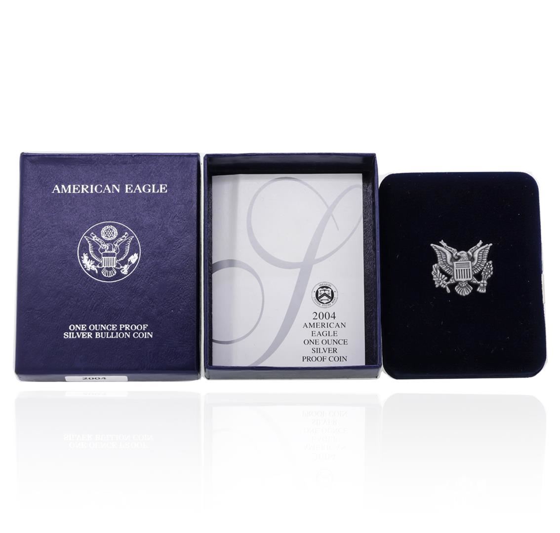 One 2004 American Eagle 1oz. Silver Proof Coin. Comes with box and certificate of authenticity.