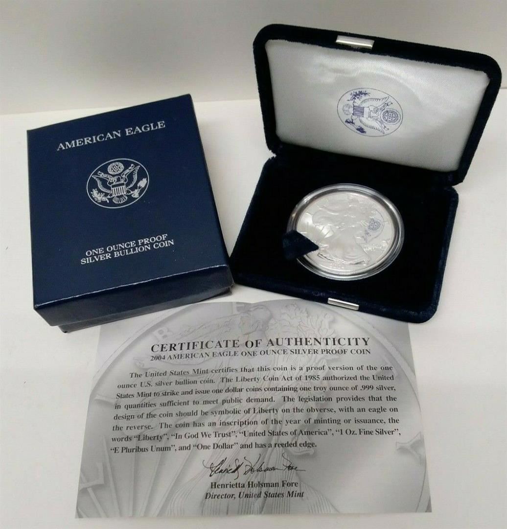 One 2004-W $1 American Silver Eagle Dollar Proof Coin w/Case & COA. The outter box has some wear.