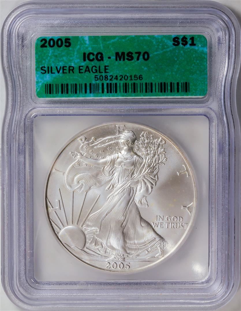 One 2005 American Silver Eagle .999 Fine Silver Dollar Coin ICG MS70.