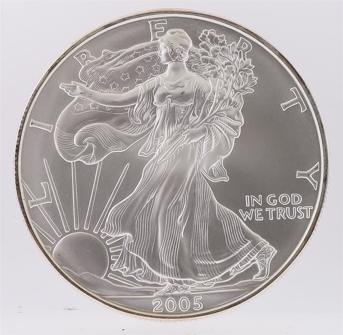 One 2005 American Silver Eagle Dollar Coin.