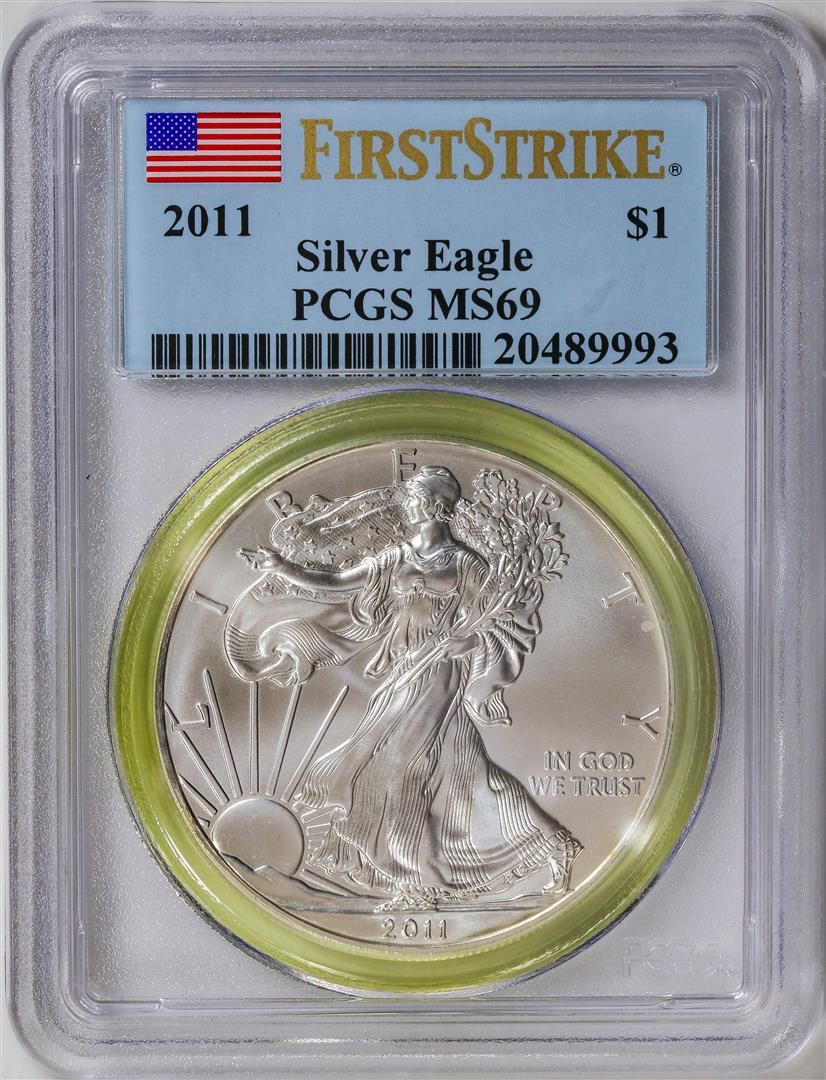 One 2011 American Silver Eagle .999 Fine Silver Dollar Coin PCGS MS69.