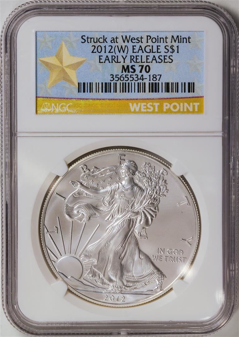 One 2012-W American Silver Eagle .999 Fine Silver Dollar Coin NGC MS70.