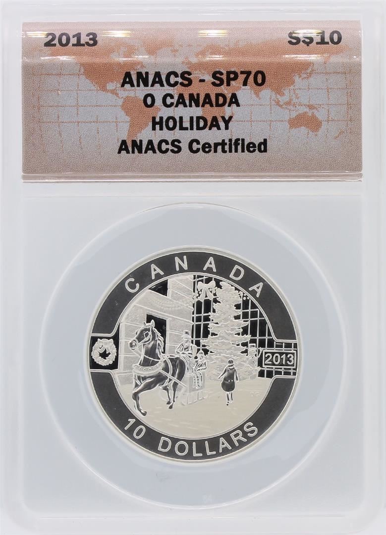One 2013 ANACS Graded SP70 O Canada Holiday $10 Fine Silver Coin. ANACS Appraised.