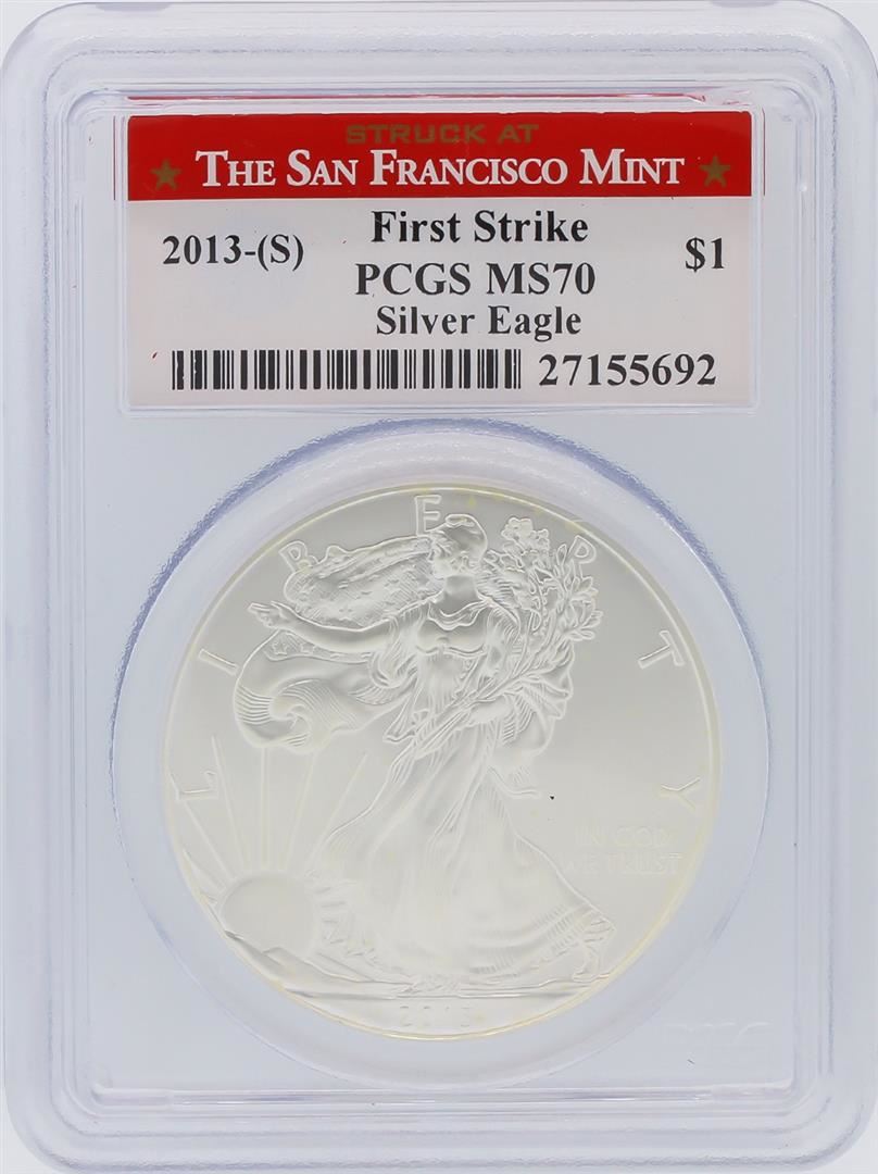 One 2013-S PCGS Graded MS70 First strike Silver Eagle Silver Dollar. PCGS Certified.