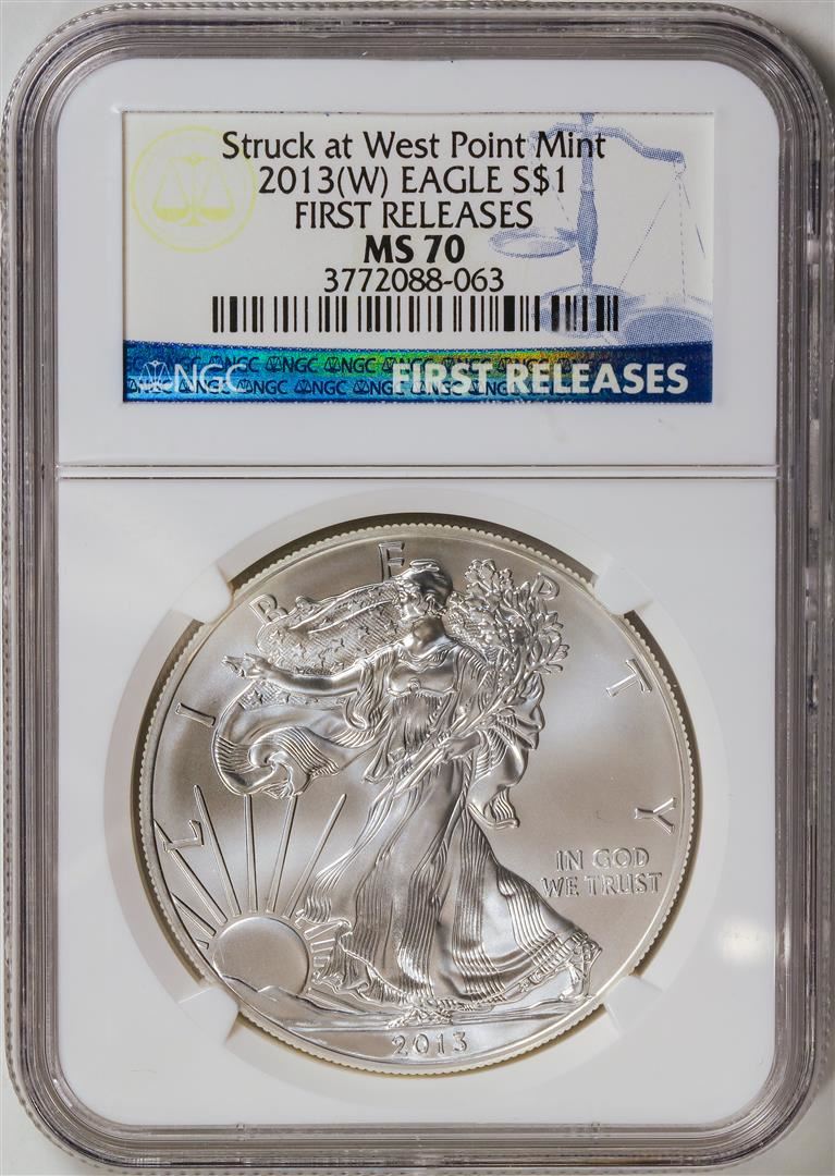 One 2013-W American Silver Eagle .999 Fine Silver Dollar Coin NGC MS70.