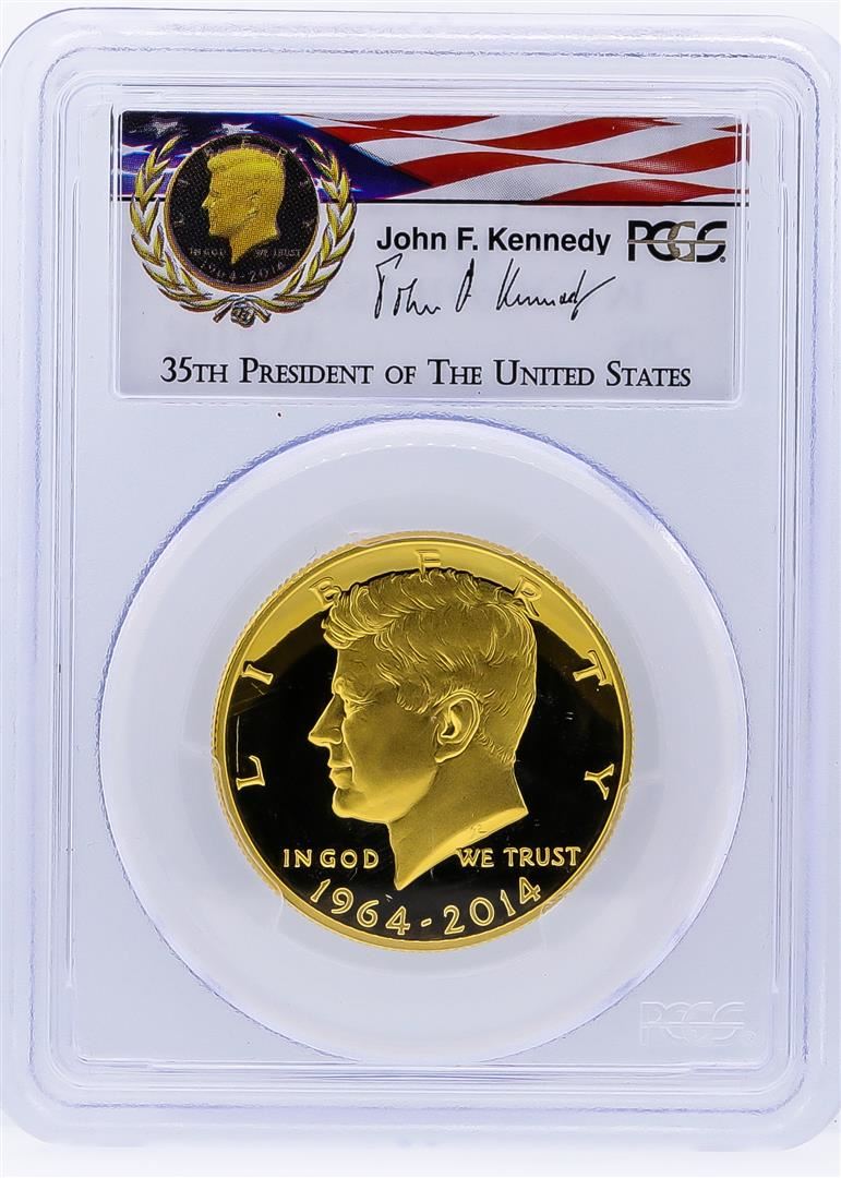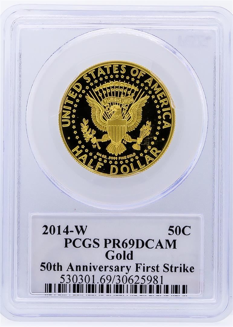 One 2014-W PCGS PR69DCAM 50th Anniversary First Strike JFK Half Dollar Gold Coin. PCGS Certified.