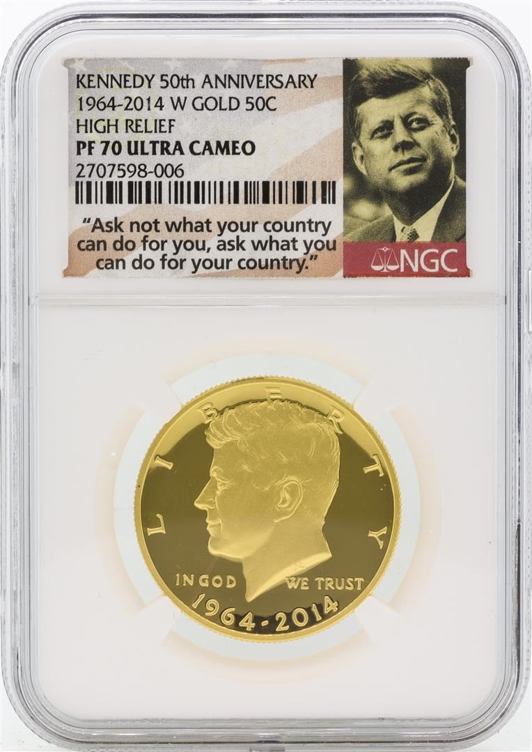 One 2014-W PF70 Ultra Cameo High Relief 50th Anniversary Kennedy Half Dollar. NGC Certified.