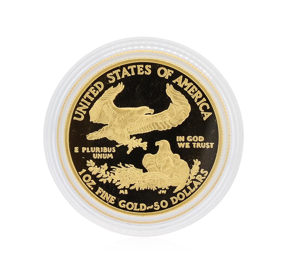 One 2015 American Eagle 1 Ounce Gold Proof Coin. Denomination: $50. Finish: Proof. Composition: 91.67% Gold 3.0% Silver Balance Copper. Content: Gold 1.0000 troy oz. (31.1035 grams). Diameter: 1.287 inches (32.70 mm). Weight: 1.0909 troy oz. (33.931 grams). Thickness: 0.113 inch (2.87 mm). Edge: Reeded. Mint: West Point. Mint Mark: W.