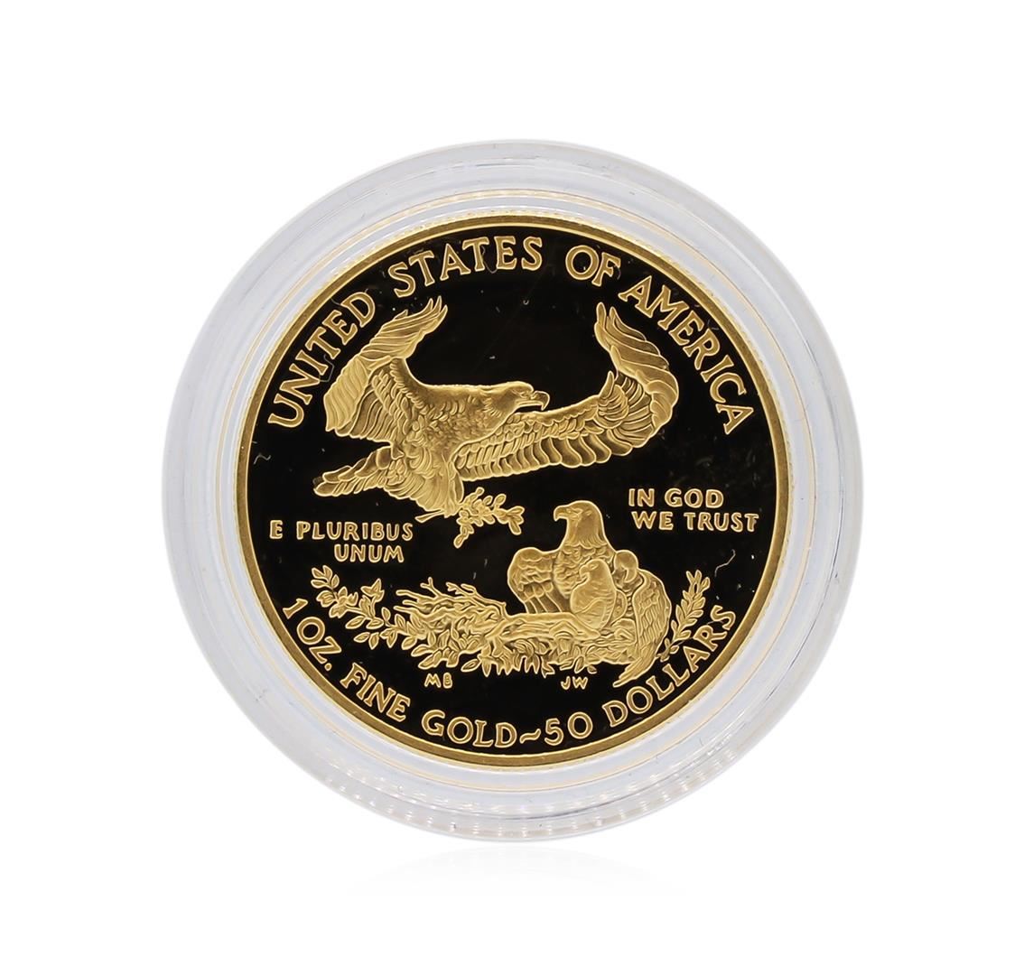 One 2015 American Eagle 1 Ounce Gold Proof Coin. Denomination: $50. Finish: Proof. Composition: 91.67% Gold 3.0% Silver Balance Copper. Content: Gold 1.0000 troy oz. (31.1035 grams). Diameter: 1.287 inches (32.70 mm). Weight: 1.0909 troy oz. (33.931 grams). Thickness: 0.113 inch (2.87 mm). Edge: Reeded. Mint: West Point. Mint Mark: W.