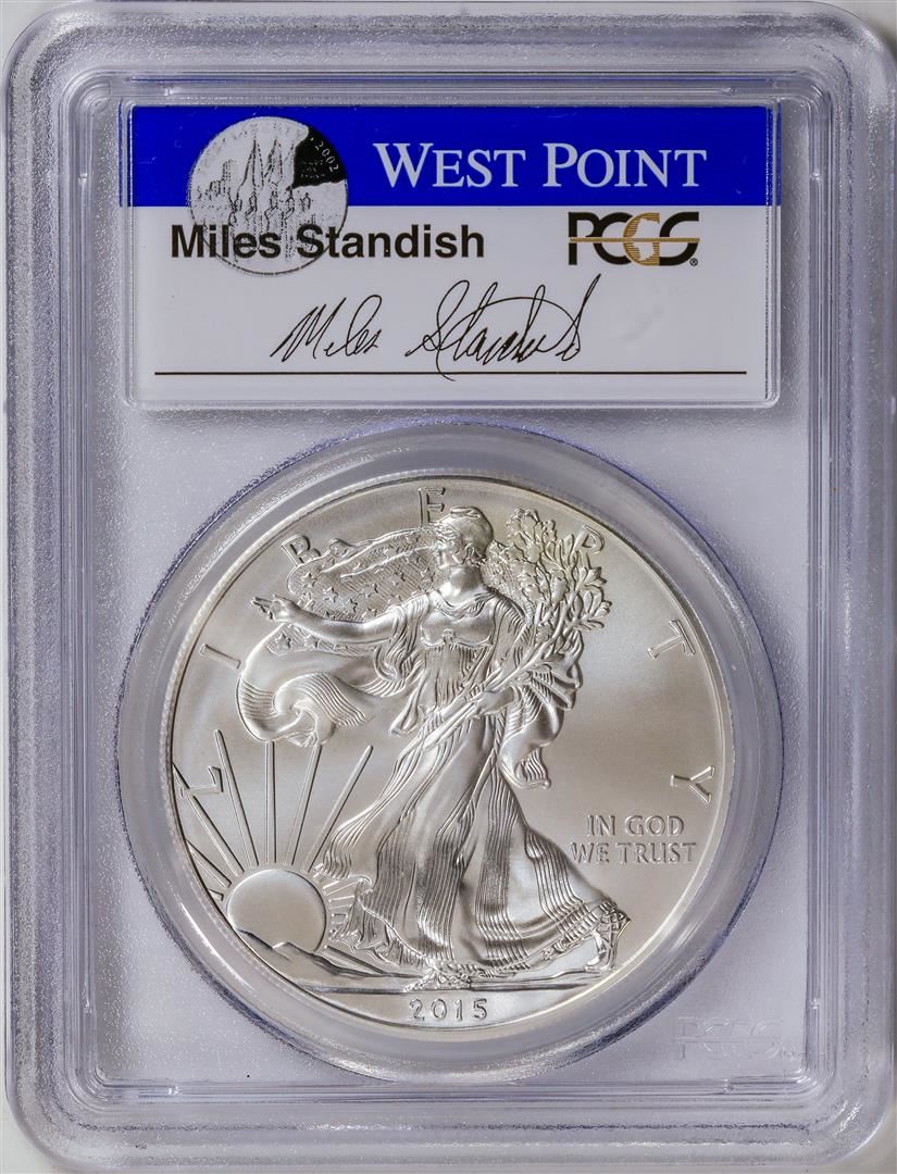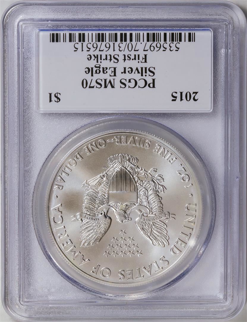 One 2015 American Silver Eagle .999 Fine Silver Dollar Coin PCGS MS70.