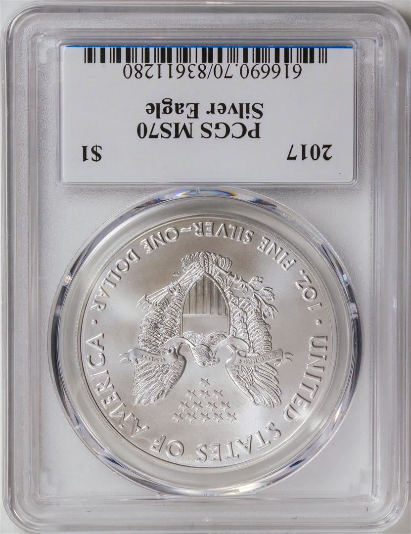 One 2017 American Silver Eagle .999 Fine Silver Dollar Coin PCGS MS70.
